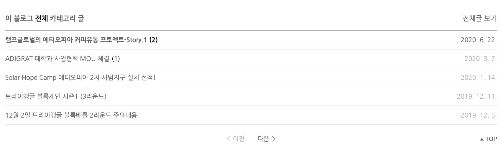 개발 현황에 대해서 살펴볼 수 있는 방법이 없으니 캠프 코인팀에서 네이버 블로그에 올린 글들을 살펴봤는데, 아래 이미지를 보면 알 수 있듯이 2020년도에 올라온 글들을 확인해보면 포스팅 업데이트가 굉장히 더딘 것을 확인할 수 있습니다. 투자자들은 실제 눈으로 볼 수 있는 부분이 마케팅적인 부분과 개발 부분인데 개발 현황도 볼 수 없고, 현재 코인 관련 사업이 어떻게 진행되고 있는지도 알 수 없습니다.