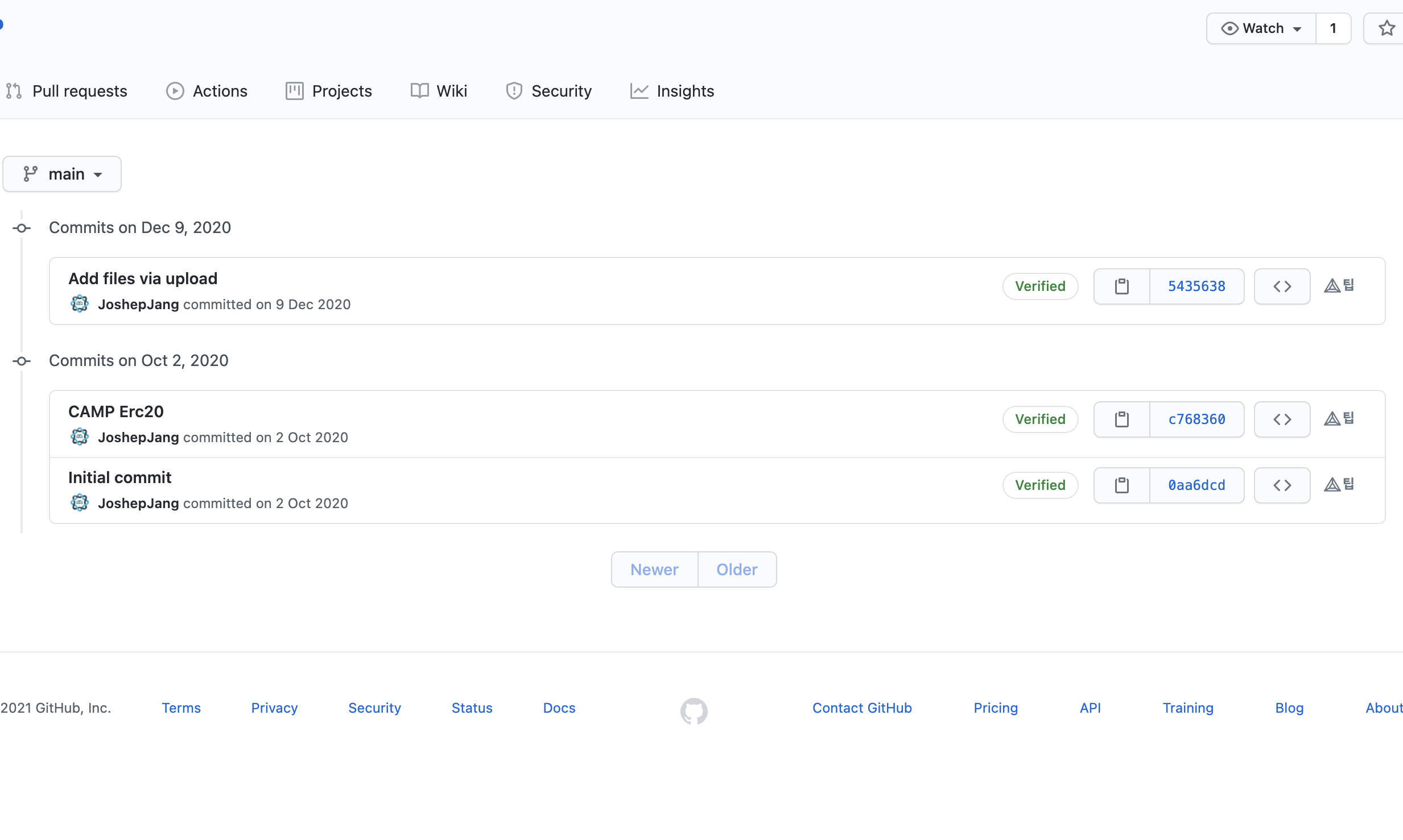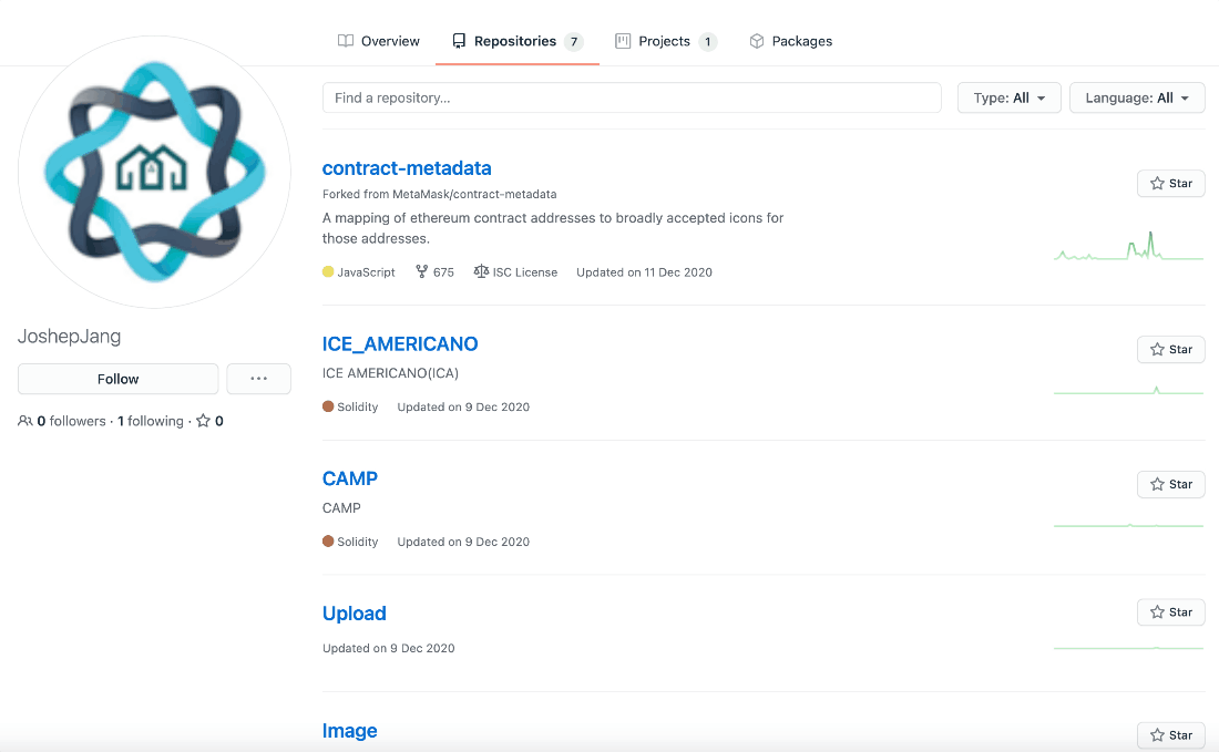 캠프코인 개발팀이 공개한 저장소는 총 7개지만 실제 개발을 코인 관련 개발을 진행한 저장소는 CAMP(ERC-20 토큰 개발) 프로젝트밖에 없는 것 같습니다.