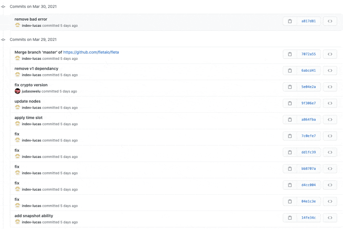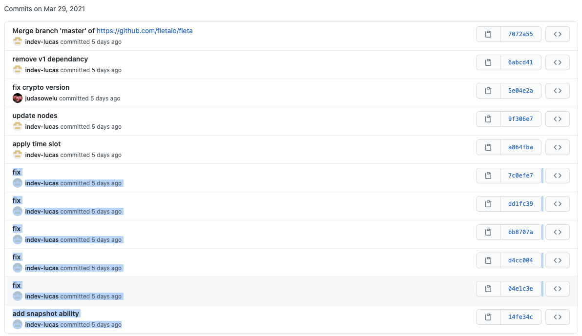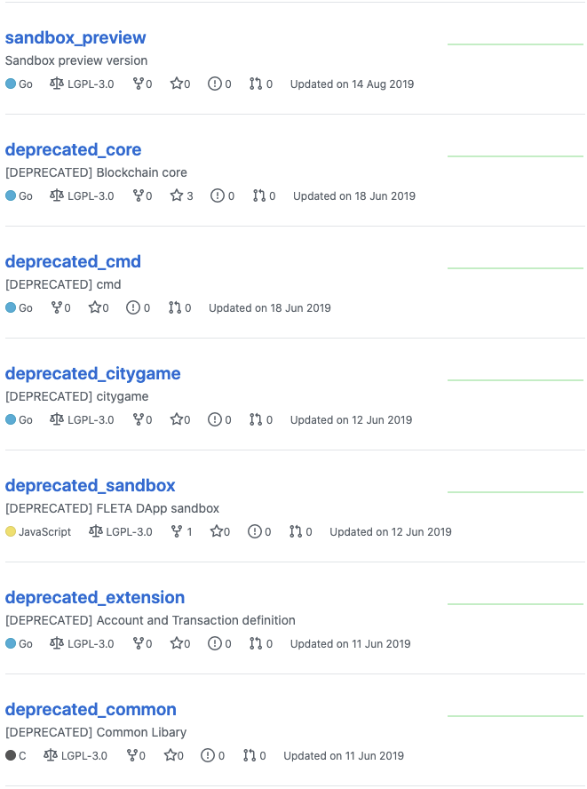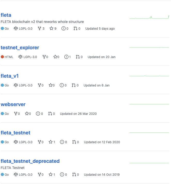 현재 플레타 개발팀이 공개한 프로젝트 중에 올해 업데이트되고 있는 프로젝트는 3개 정도로 굉장히 업데이트가 저조한 것을 확인할 수 있습니다. 대부분의 저장소가 2019년도에 업데이트가 멈췄고, 현재 코인 관련 프로젝트로 보이는 것은 fleta 저장소 정도로 보이네요.