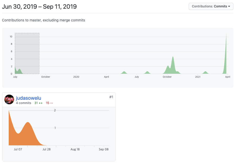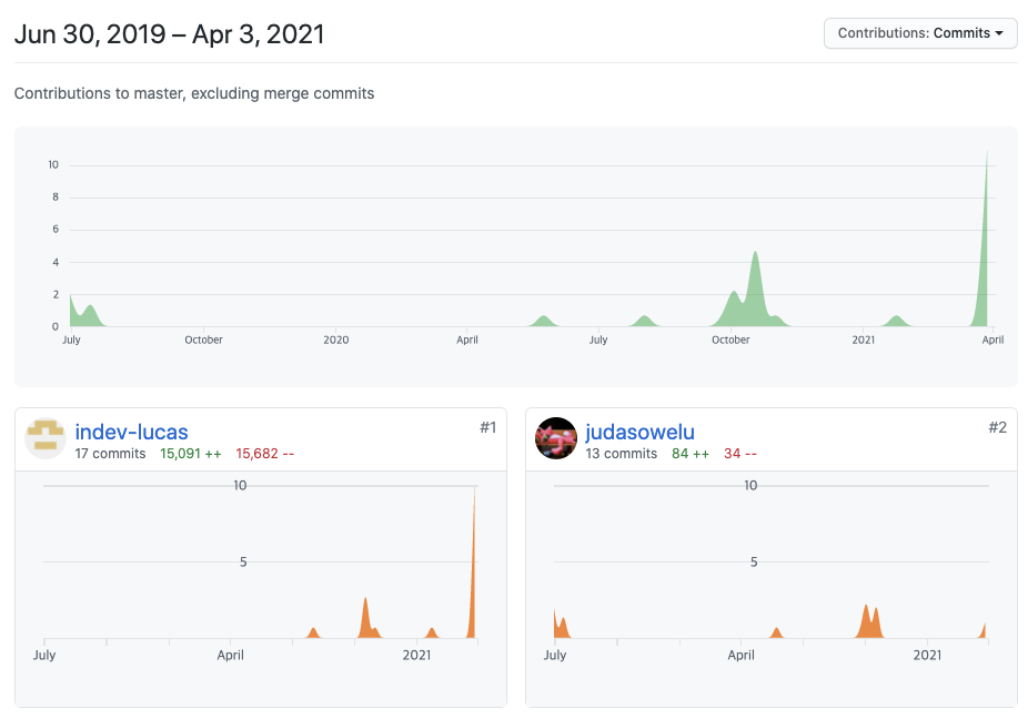 프로젝트 내에서 참여자들이 프로젝트 코드를 수정한 후 메시지를 남긴 개수입니다. 현재까지 프로젝트에 남겨진 커밋수는 431개로 2019년 6월 30일부터 진행된 프로젝트임을 감안하면 낮은 커밋수입니다. (기준: 1일 1커밋, *프로젝트 참여자 수, 프로젝트 특성에 따라서 기준이 다를 수 있습니다. 단순히 커밋수로 프로젝트를 판단할수는 없습니다. 단순 참고용으로만 봐주세요.)