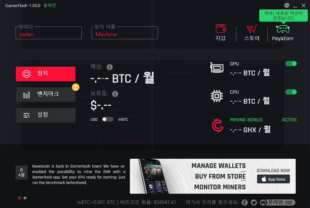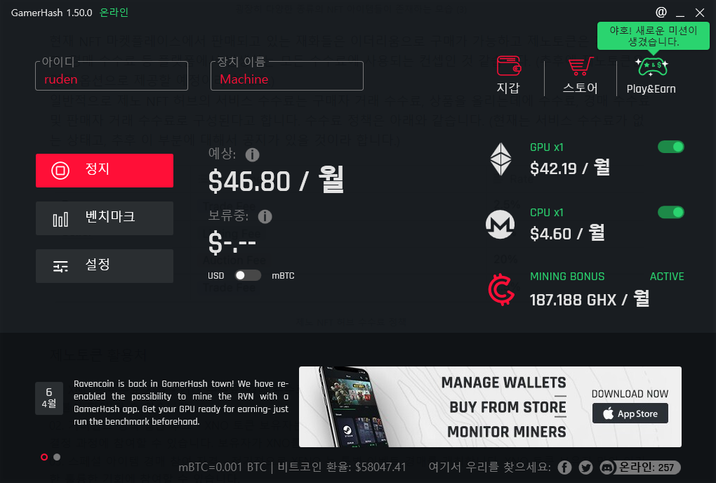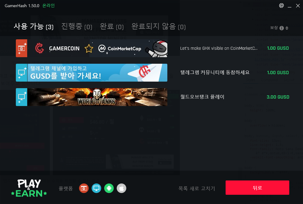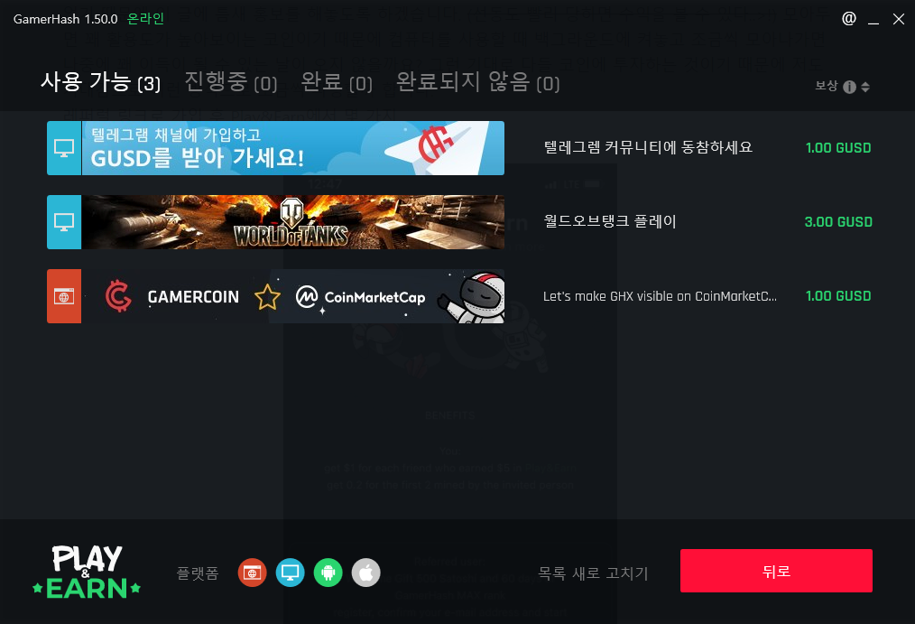 모바일 애플리케이션을 설치하고 계정을 연동하면, 컴퓨터에서 채굴하고 있는 게이머해시의 상태를 공유하게 됩니다. 지갑과 제휴하고 있는 상품 등을 확인할 수 있습니다.