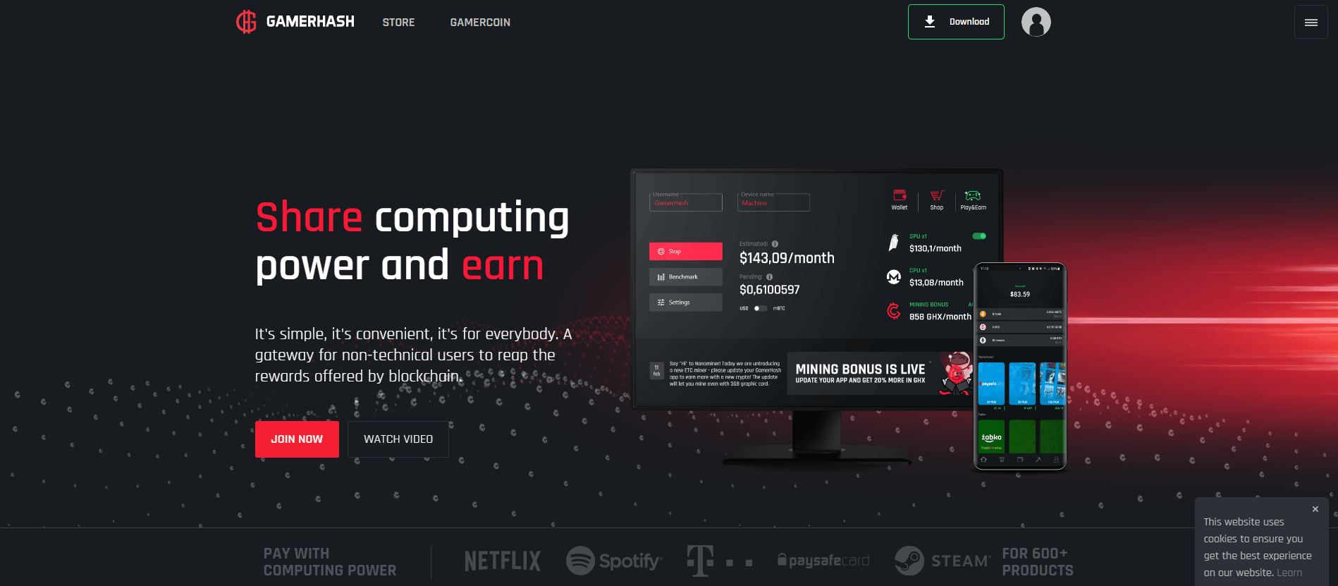 우리의 50만 명 이상의 사용자는 블록 체인을 이용하고 게임과 기프트카드를 여분의 컴퓨터 파워로 지불 합니다.