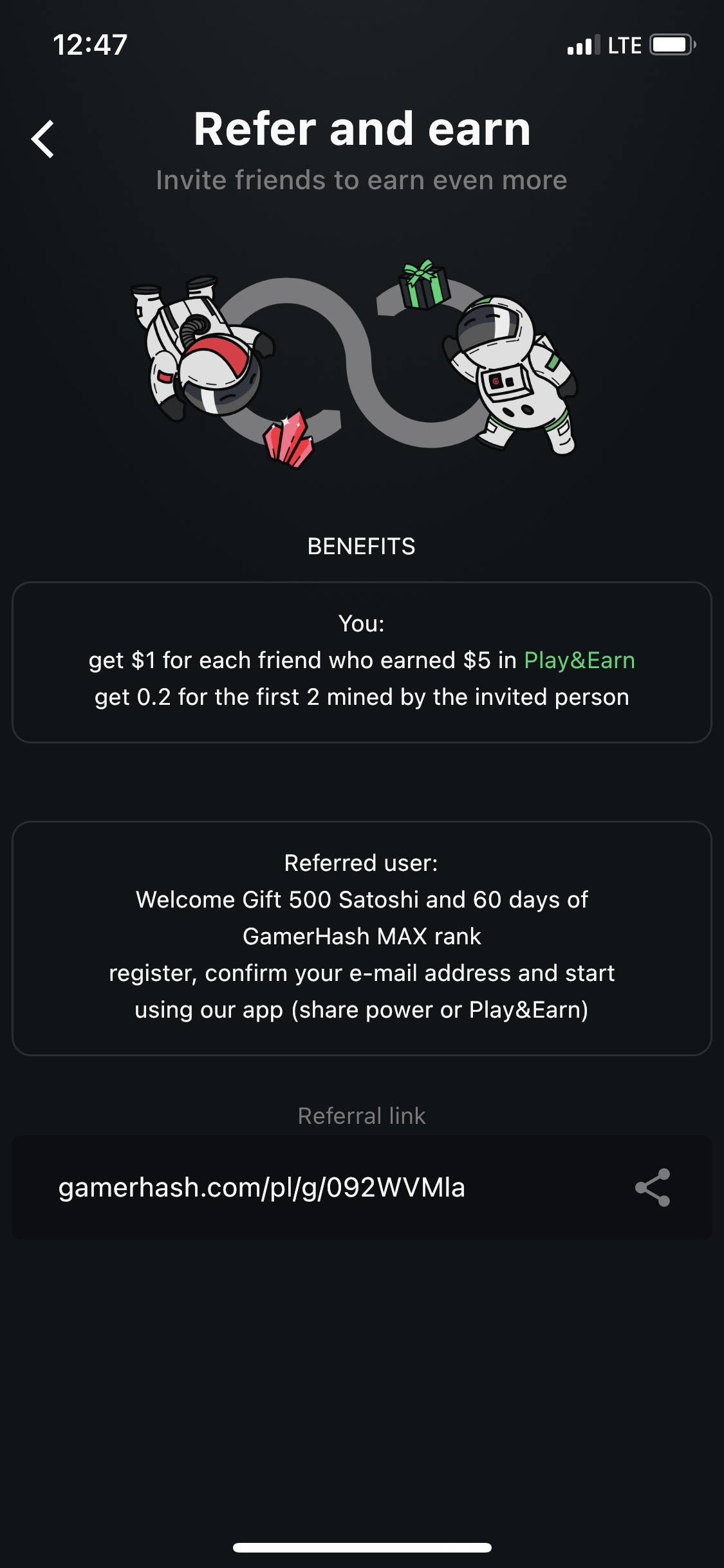 레퍼럴 링크로 가입 후 Play&Earn에서 몇 가지 미션을 수행 후 보상을 받으면, 저도 그에 따른 보상을 조금 받는 것 같습니다.