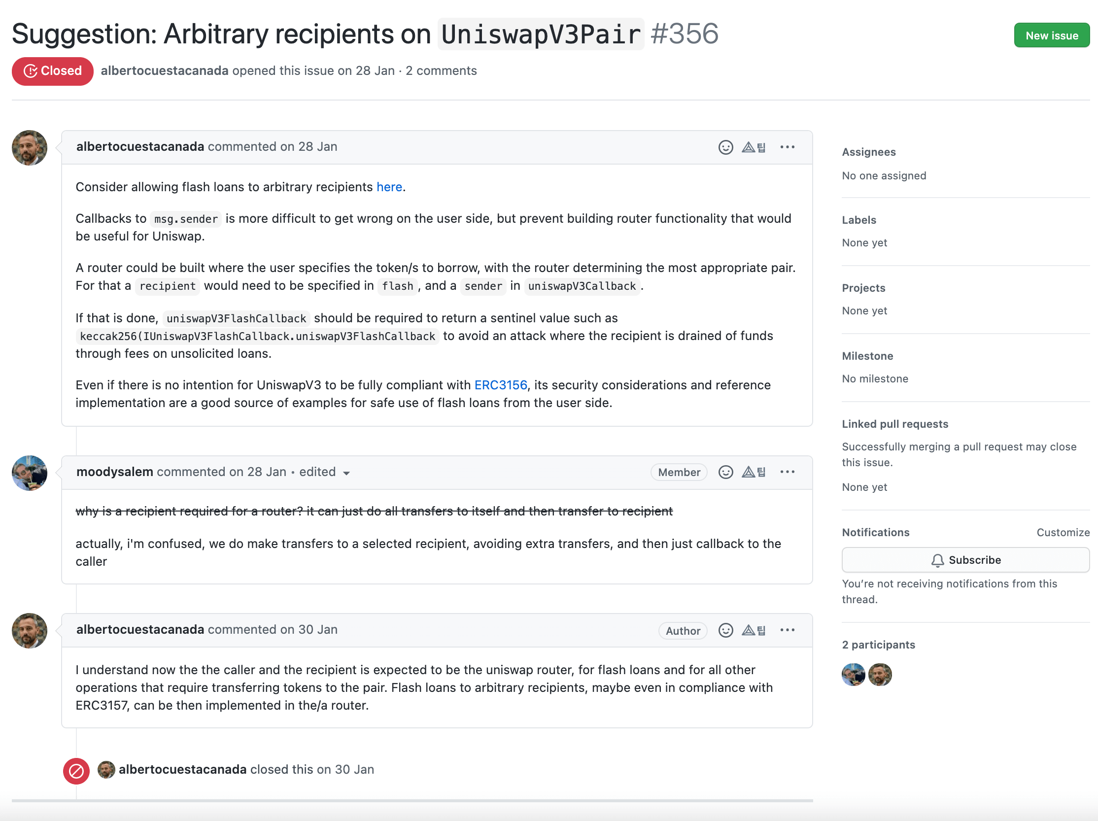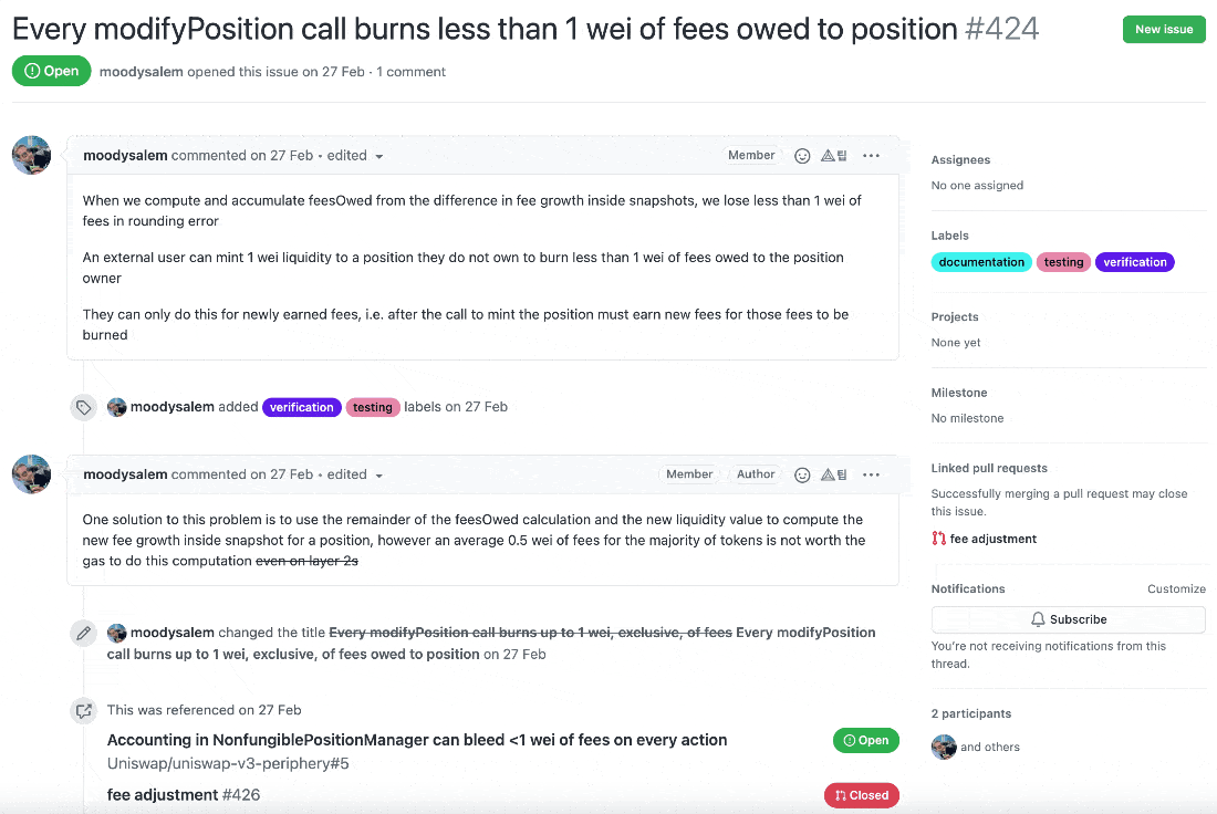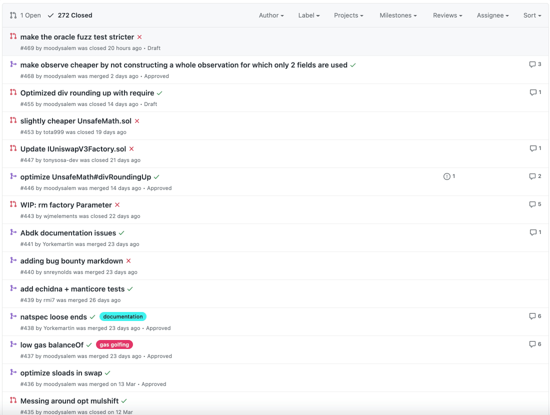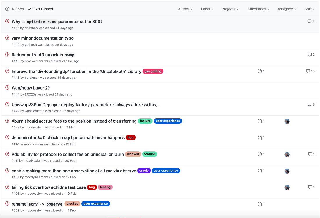 이정도 개발 현황을 보여줘야 투자자들이 안심하고 미래가치를 생각하고 투자를 할 수 있죠. 백서만 작성하고 제대로 개발도 안하면서 마케팅으로 코인 시세만 높이려고 안달난 곳은 정말 반성해야 합니다. 단지 uniswap-v3-core 저장소 하나만 살펴보긴 했지만 하나를 보면 열을 안다는 속담이 있듯이 이렇게 프로젝트를 제대로 관리하는 모습을 보면 다른 프로젝트들도 비슷한 수준으로 관리되거나 개발되고 있겠죠.