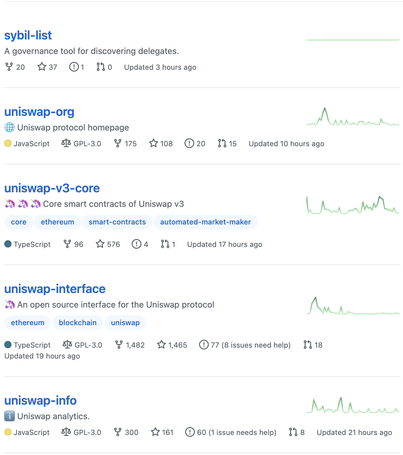 유니스왑(UNI, Uniswap) 코인 개발 현황을 한번 살펴보도록 하겠습니다. 유니스왑 깃허브 프로젝트는 아래 링크에서 확인할 수 있습니다.