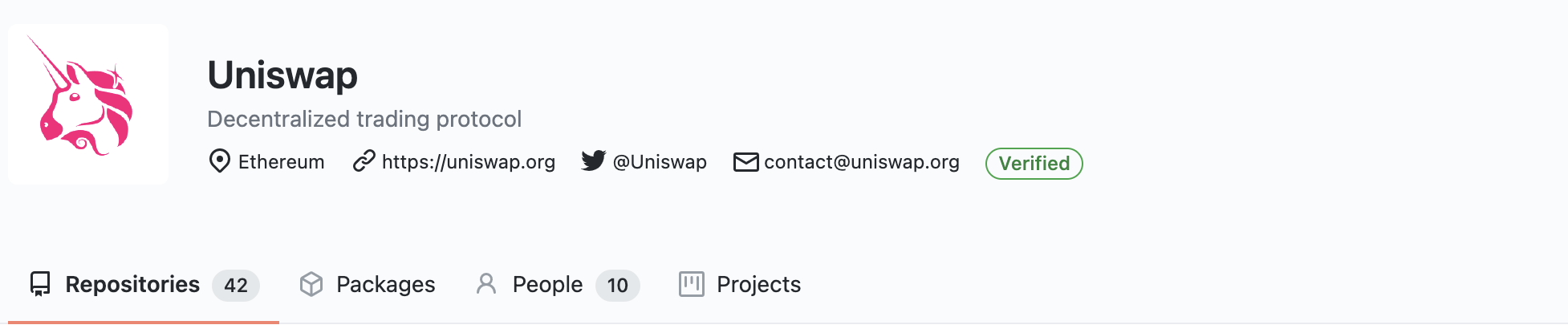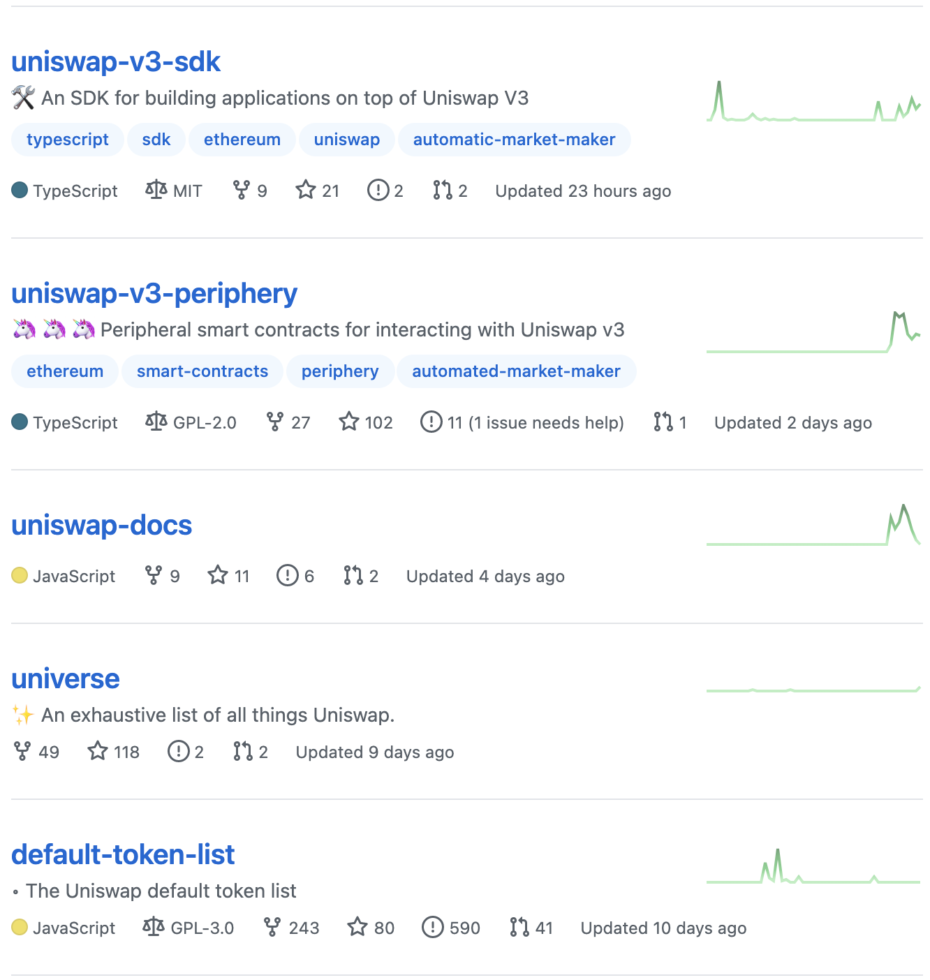 유니스왑 개발팀이 공개한 깃허브 오픈소스 프로젝트에는 현재 42개의 저장소가 생성되어 있는 것을 확인할 수 있습니다.