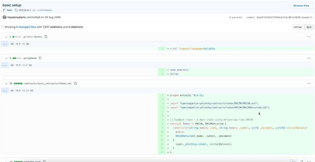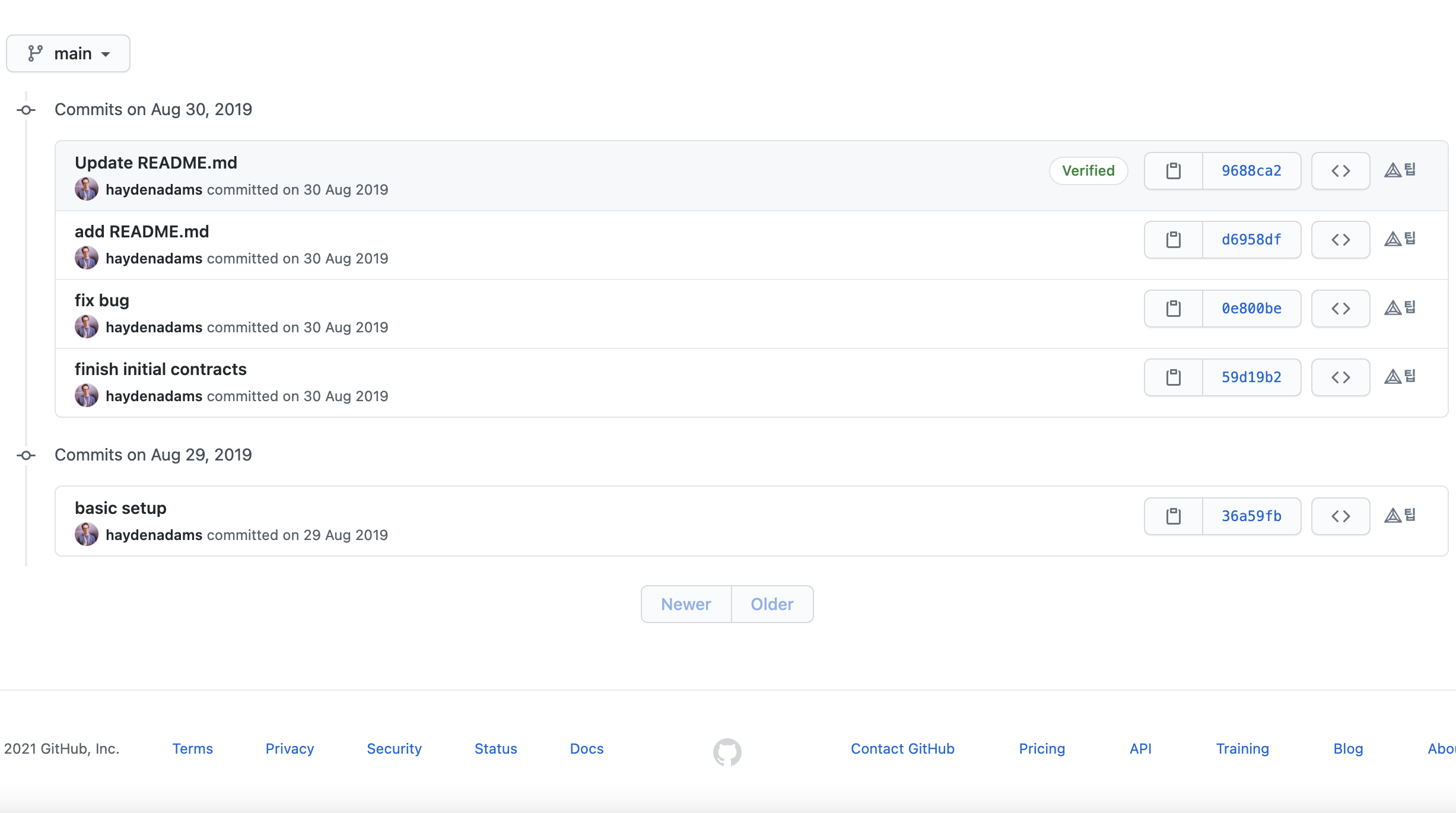 유니스왑 개발팀이 실제 초기부터 개발을 진행했는지 프로젝트 초기 커밋 기록들을 살펴봅니다. 해당 프로젝트는 2019년 8월 25일에 생성되었습니다.