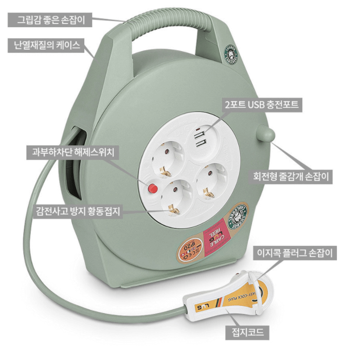 제가 구매한 제품은 3구 슬림형 캠핑릴선 15M 코드릴 제품이라서 3구에 USB포트가 2개 제공되고 있습니다. 공식 홈페이지에서 제공하는 제품 설명은 아래와 같습니다.