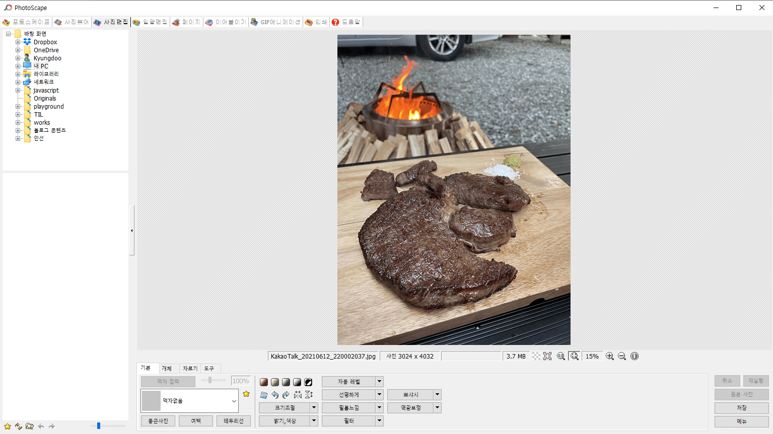 사진편집으로 이동하면 좌측에 내 컴퓨터 디렉토리 구조가 나오고 여기서 이미지를 선택할 수 있습니다. 저는 모자이크 처리 예시를 들기 위해 캠핑 때 찍은 고기 사진을 가져왔습니다.