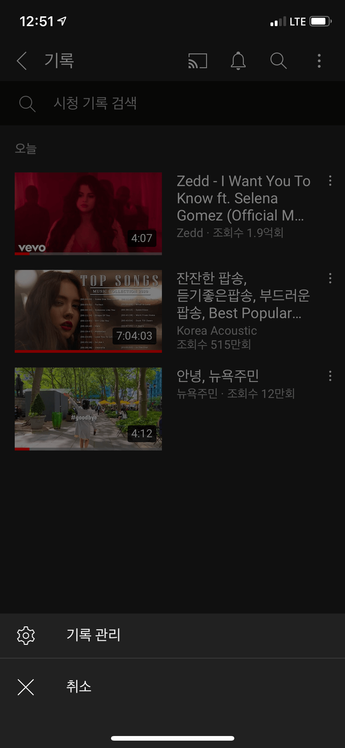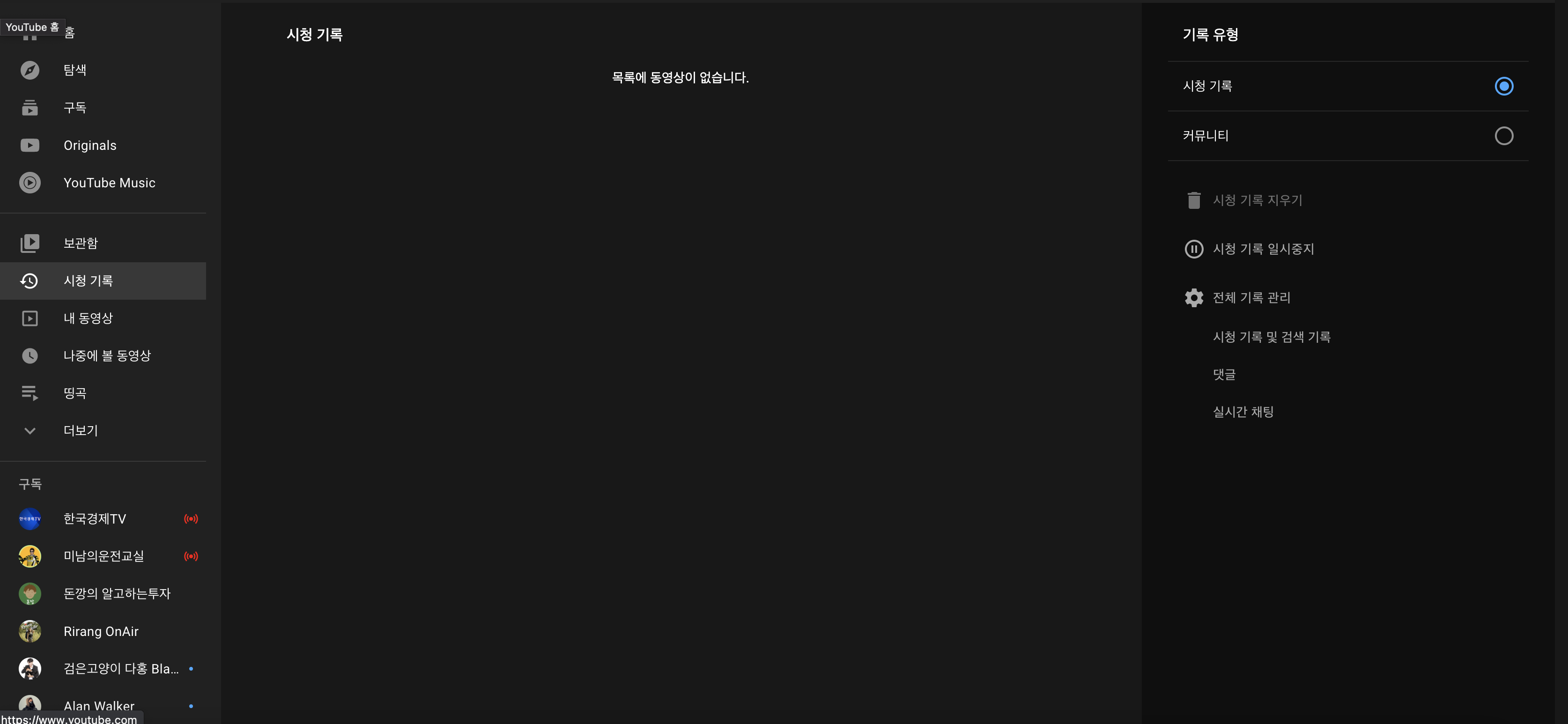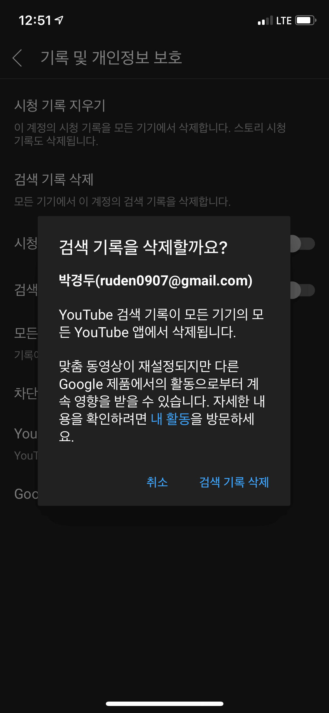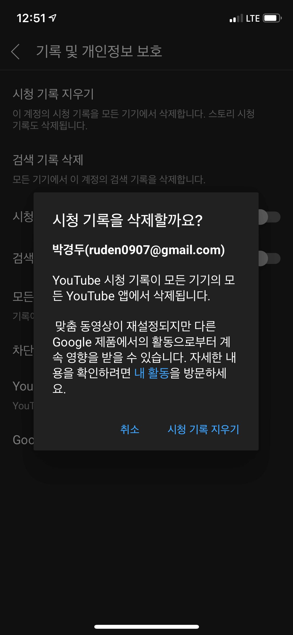 참고로 내 기록을 삭제하면 내 기록 기반으로 연관 동영상을 소개해주는 부분이 제대로 뜨지 않을 수 있으니 이점 참고하시고 삭제를 결정하시면 될 것 같습니다.