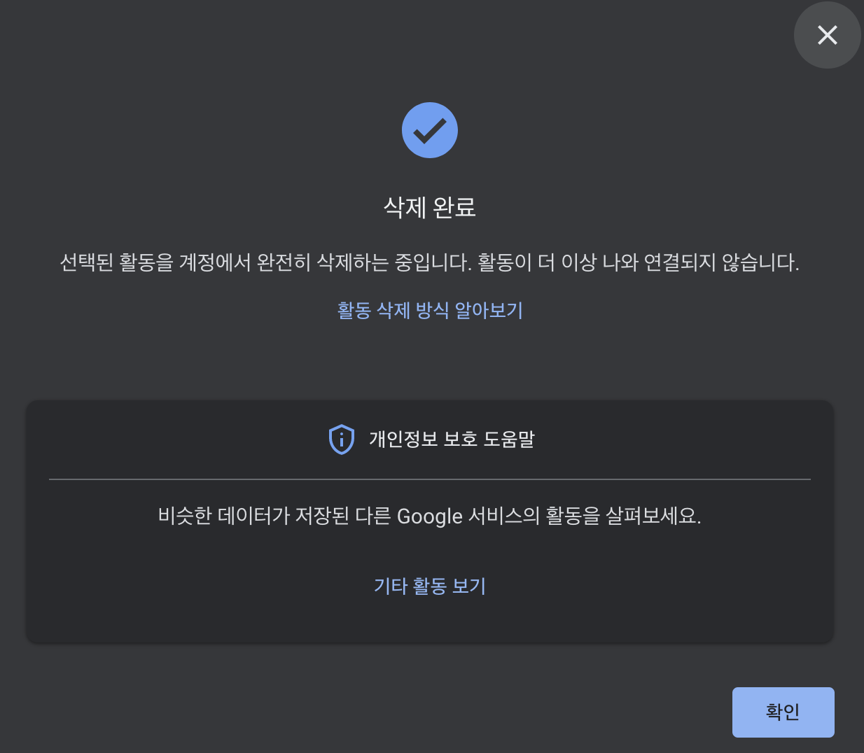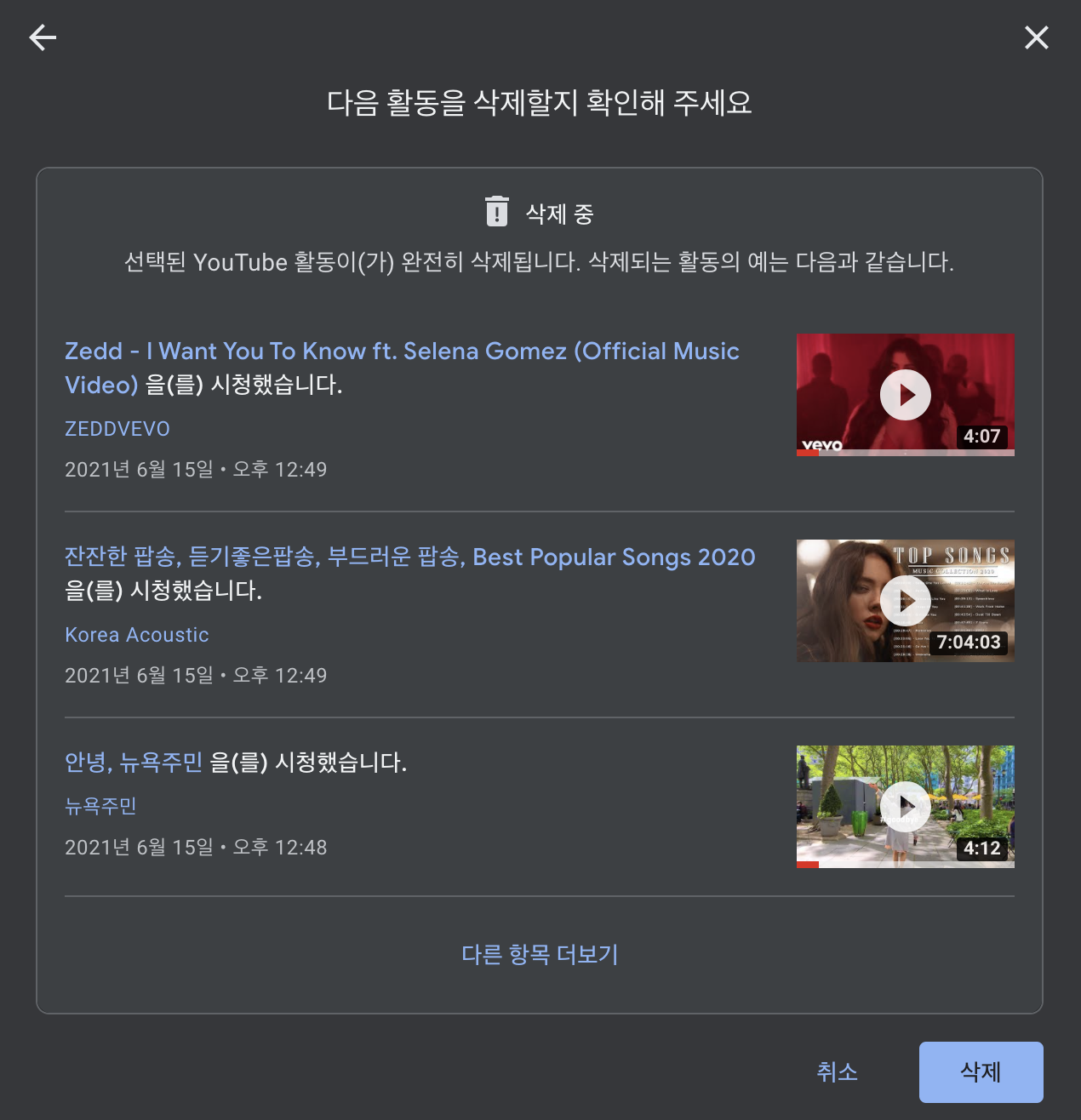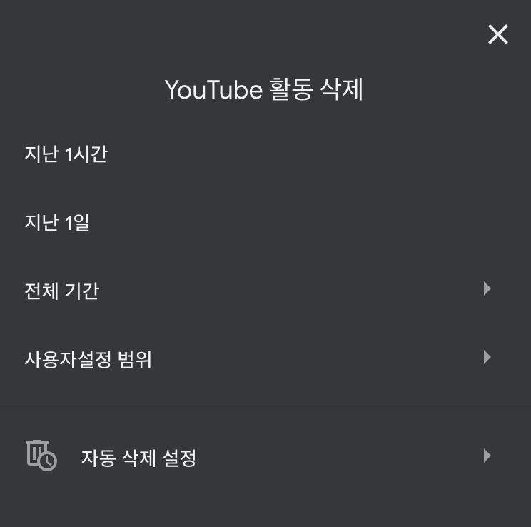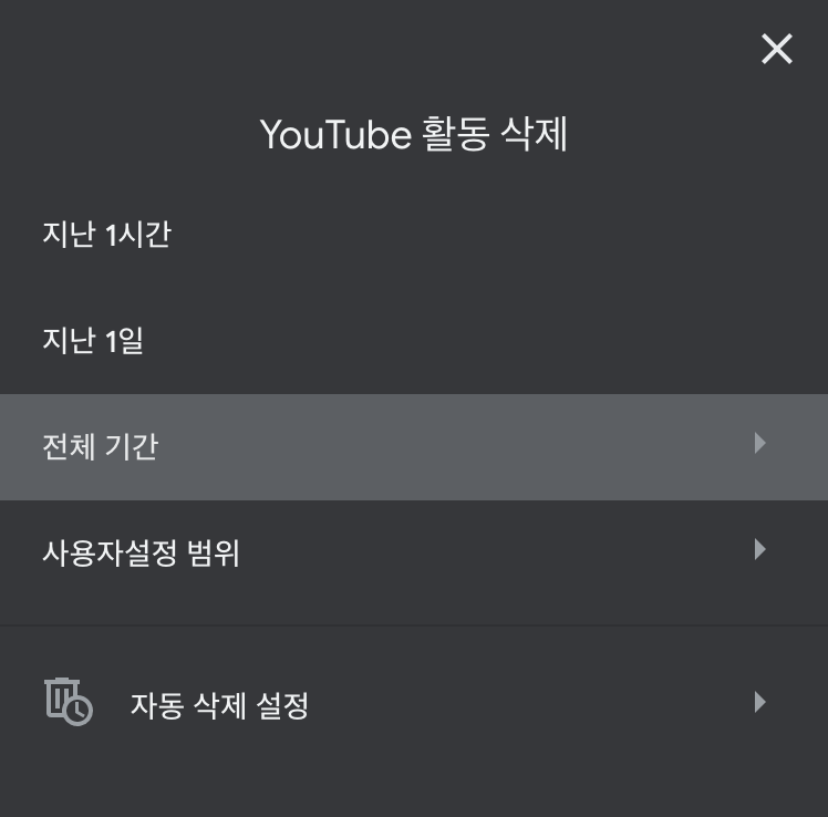 - Youtube 활동 삭제 > 전체 기간 > 삭제