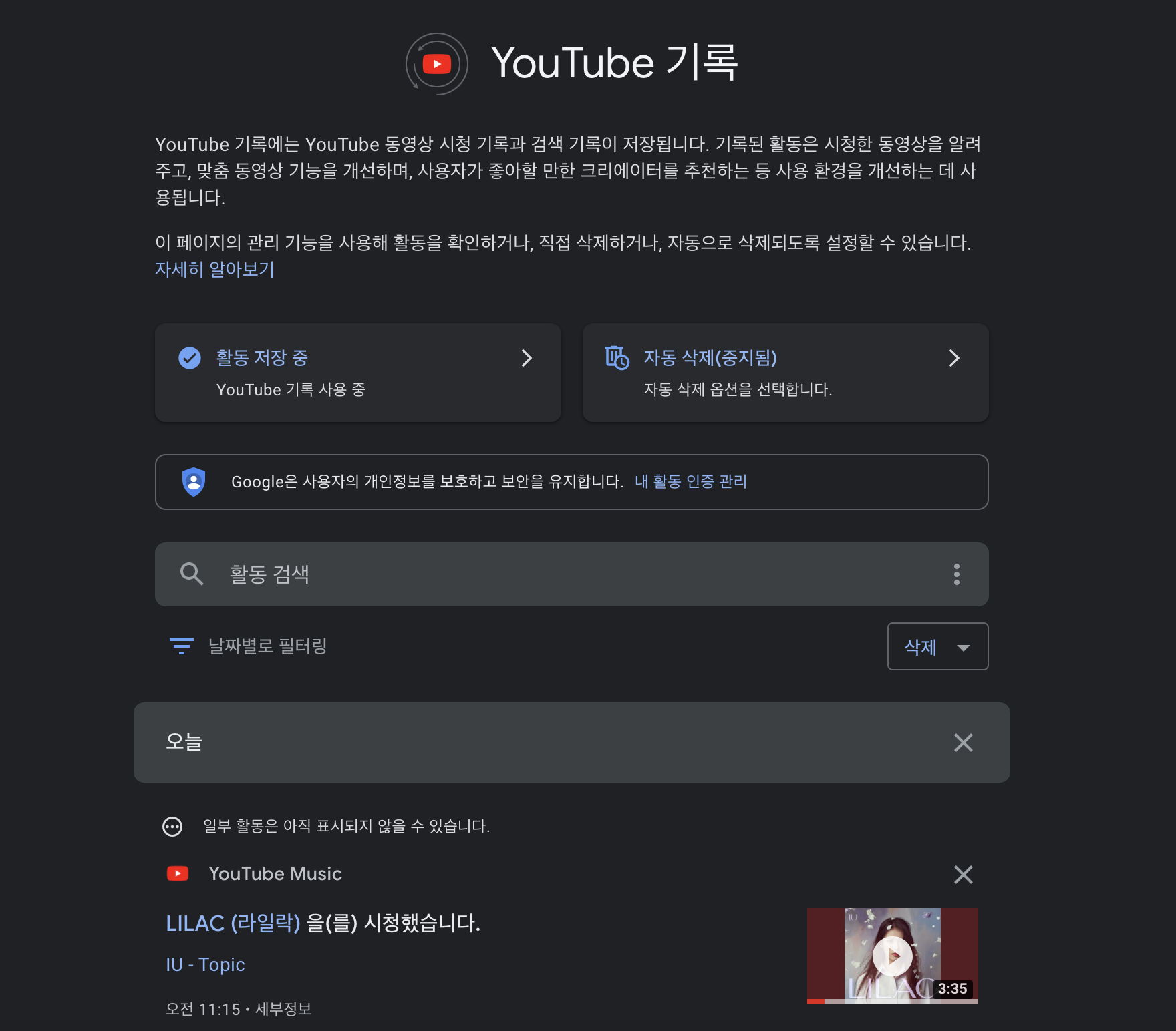 아래 공유드린 경로로 구글 내 활동 페이지로 이동하면 유튜브 활동 기록 페이지로 바로 이동할 수 있습니다.