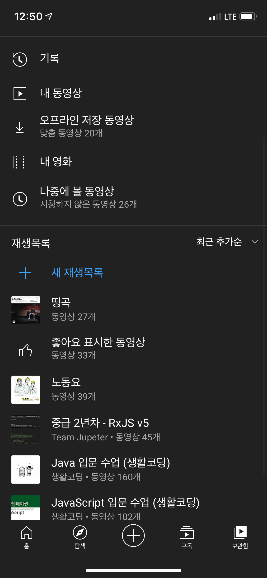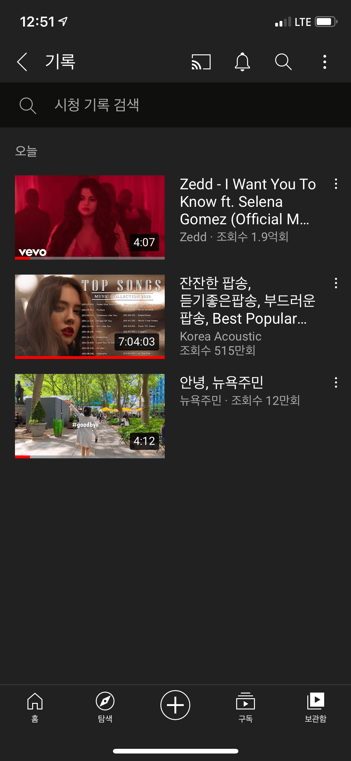 모바일에서도 위에서 공유드린 내 활동 경로로 접근해서 삭제하는 것이 깔끔합니다. 하지만 앱에서도 해당 기능을 제공하는 것을 보여드리기 위해 공유드립니다. 유튜브 애플리케이션을 실행하고 아래 보관함을 클릭해서 이동하면 기록이라는 메뉴가 있습니다.