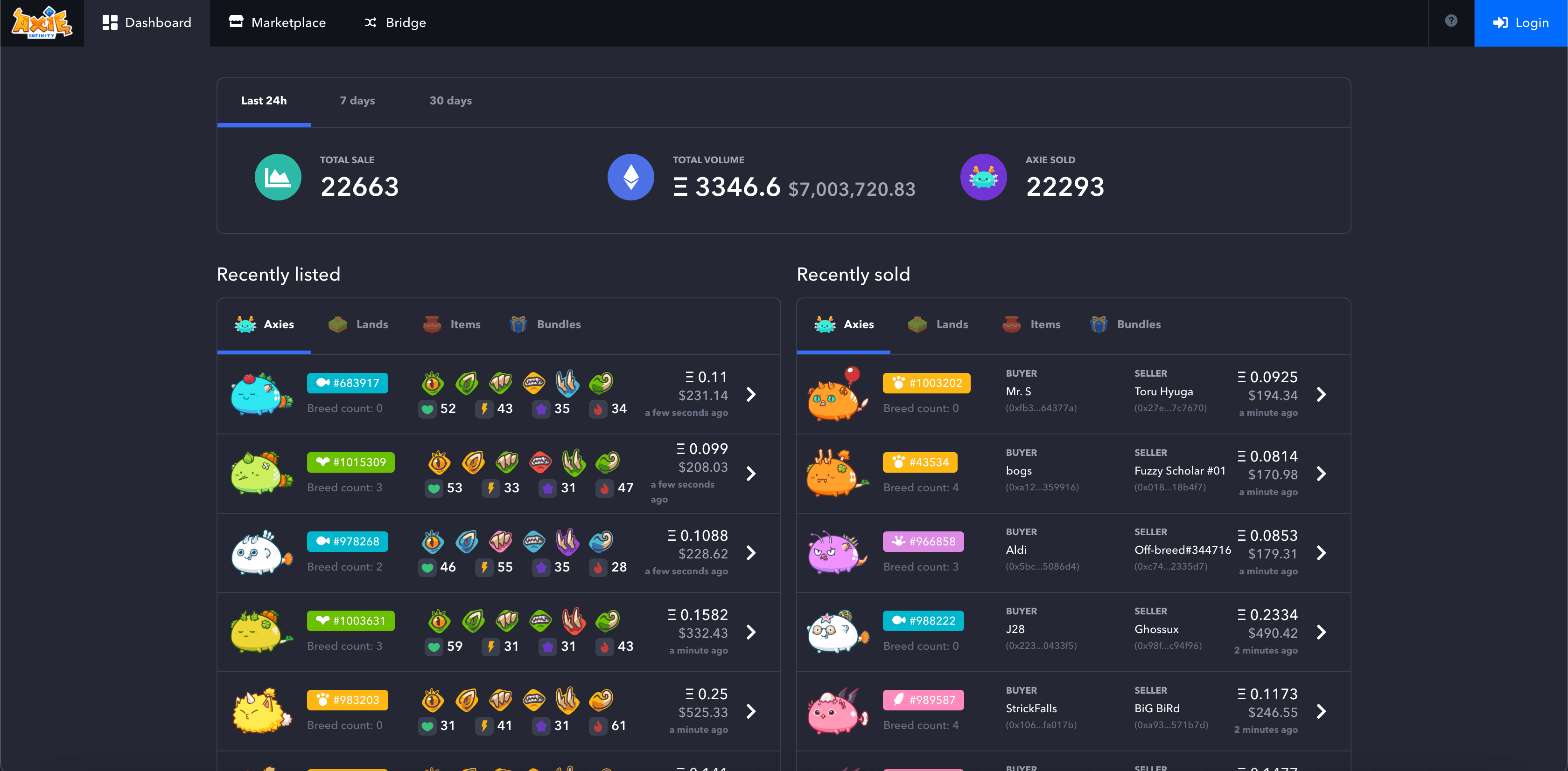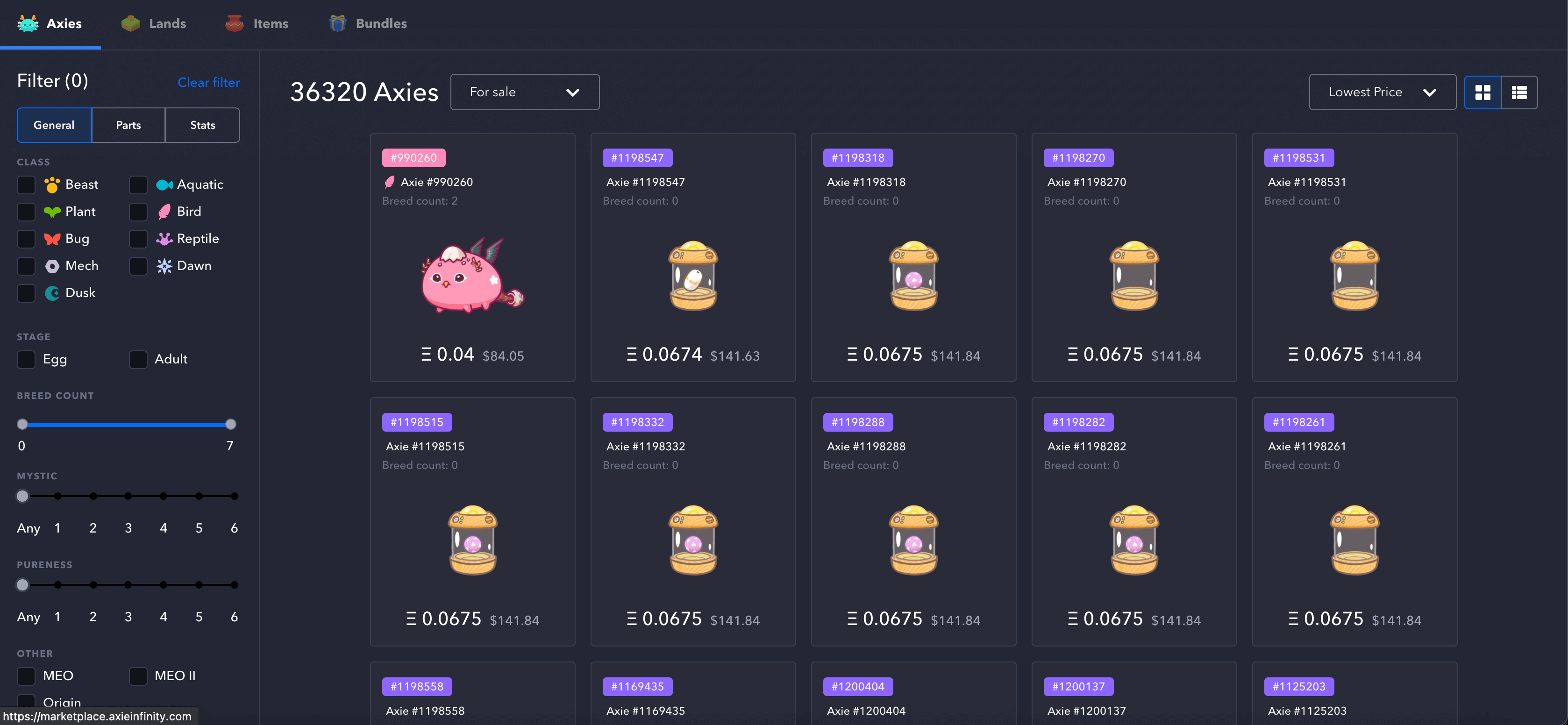 엑시 인피니티 마켓 플레이스를 살펴보면 실제 게임 아이템을 판매하듯이 NFT(게임 아이템)가 판매되고 있음을 확인할 수 있습니다. 우리가 일반적으로 즐기는 게임 내에서 상위 클래스 아이템들이 비싼 가격에 거래되듯이 엑시 인피니티에서 상위 클래스 NFT는 굉장히 높은 가격에 거래되겠죠.