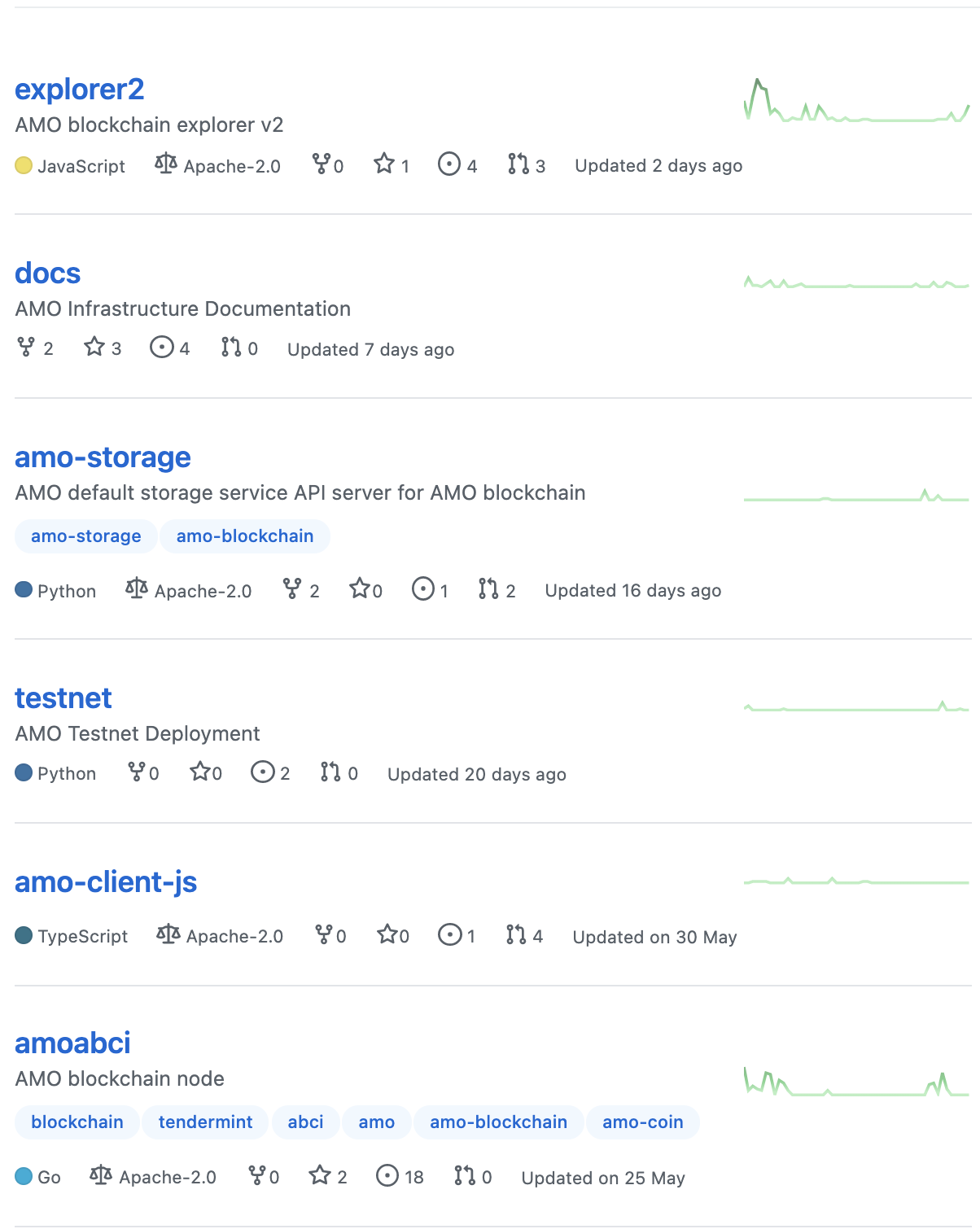 AMO Labs 깃허브 업데이트 현황을 살펴보면 explorer2 저장소를 제외한 나머지 저장소는 거의 업데이트가 없다고 볼 수 있습니다.