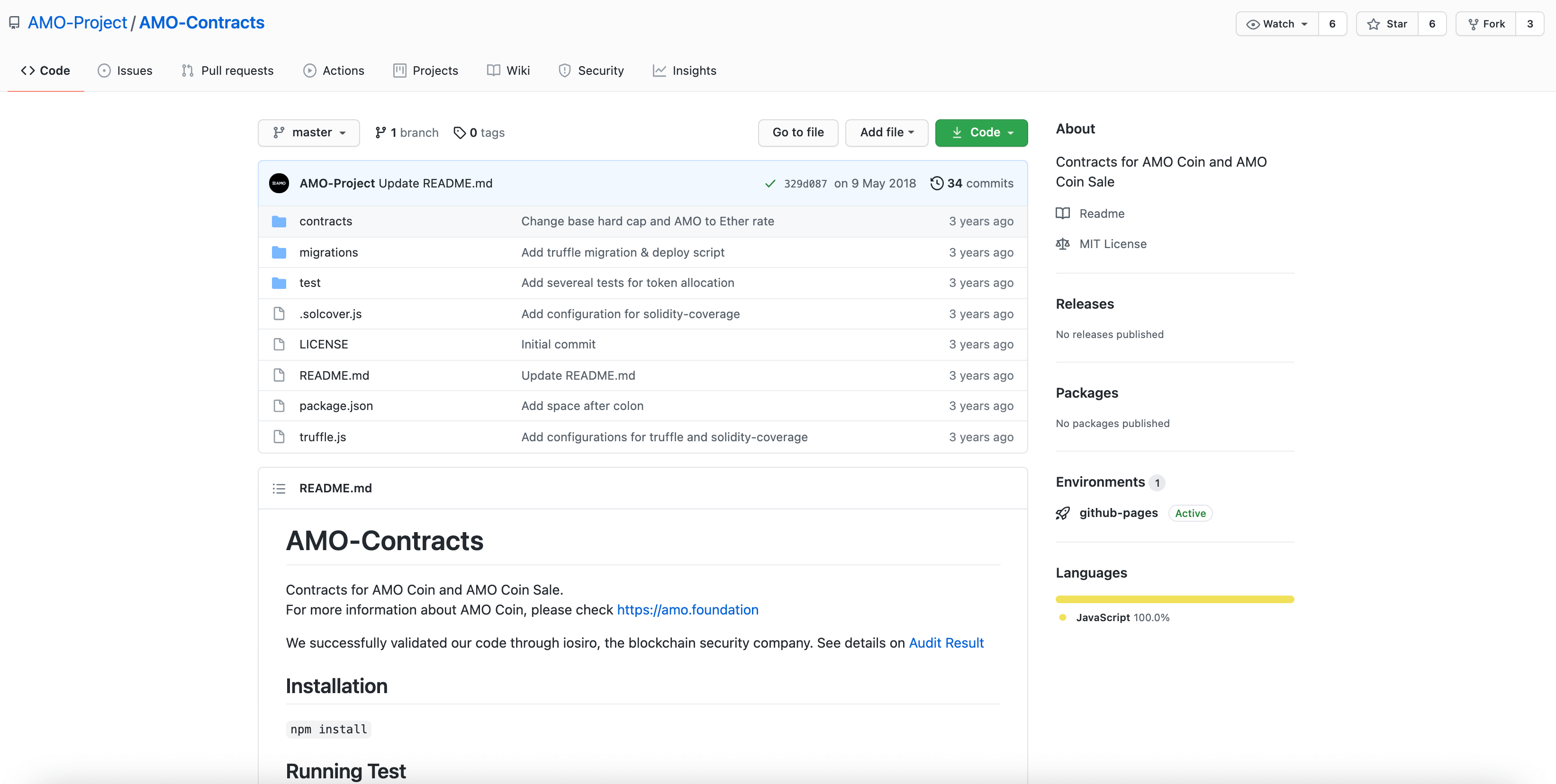 아모코인 토큰 개발 저장소를 살펴보면 2018년(3년 전)에 토큰 개발이 이미 완료되었고, 그 이후로 전체 깃허브 프로젝트에 딱히 업데이트는 없었던 것을 확인할 수 있습니다.