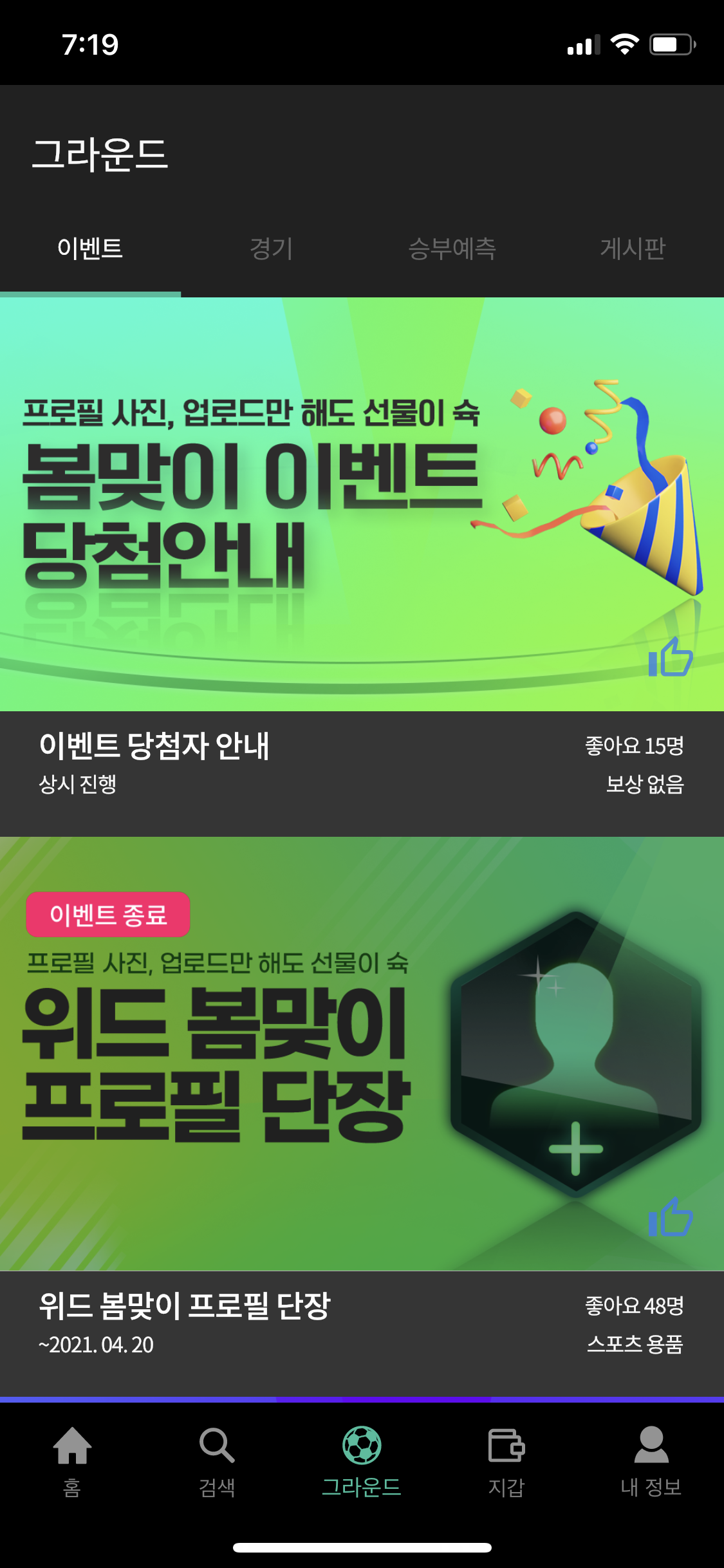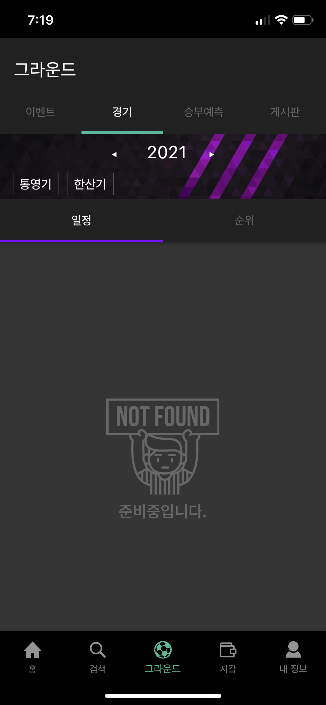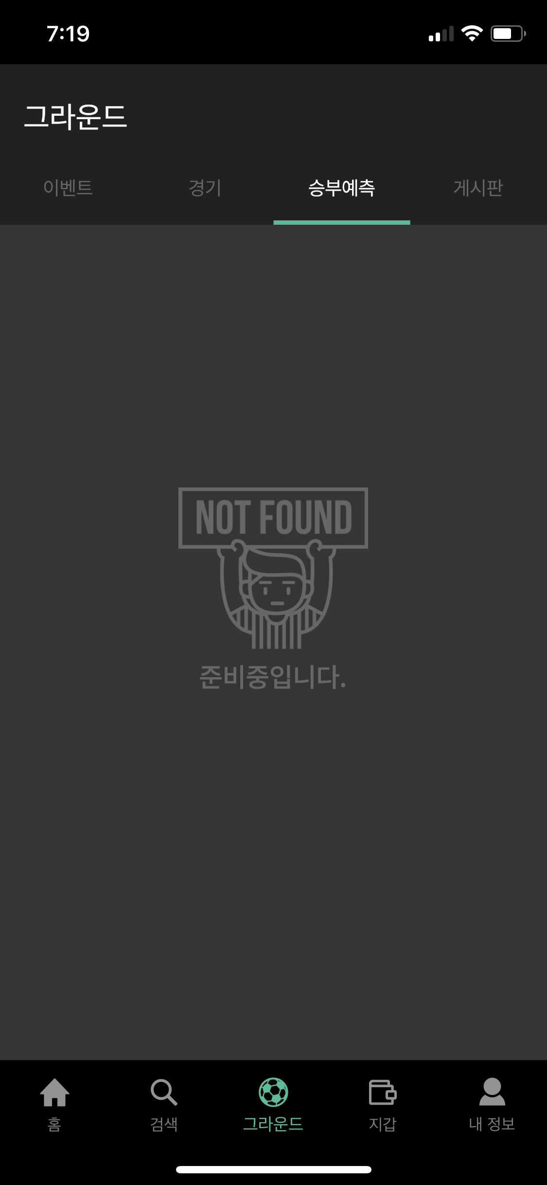 그라운드 메뉴에 경기, 승부예측 등 다양한 기능을 제공하고자 열어놨지만 현재 준비중인 것을 확인할 수 있습니다.
