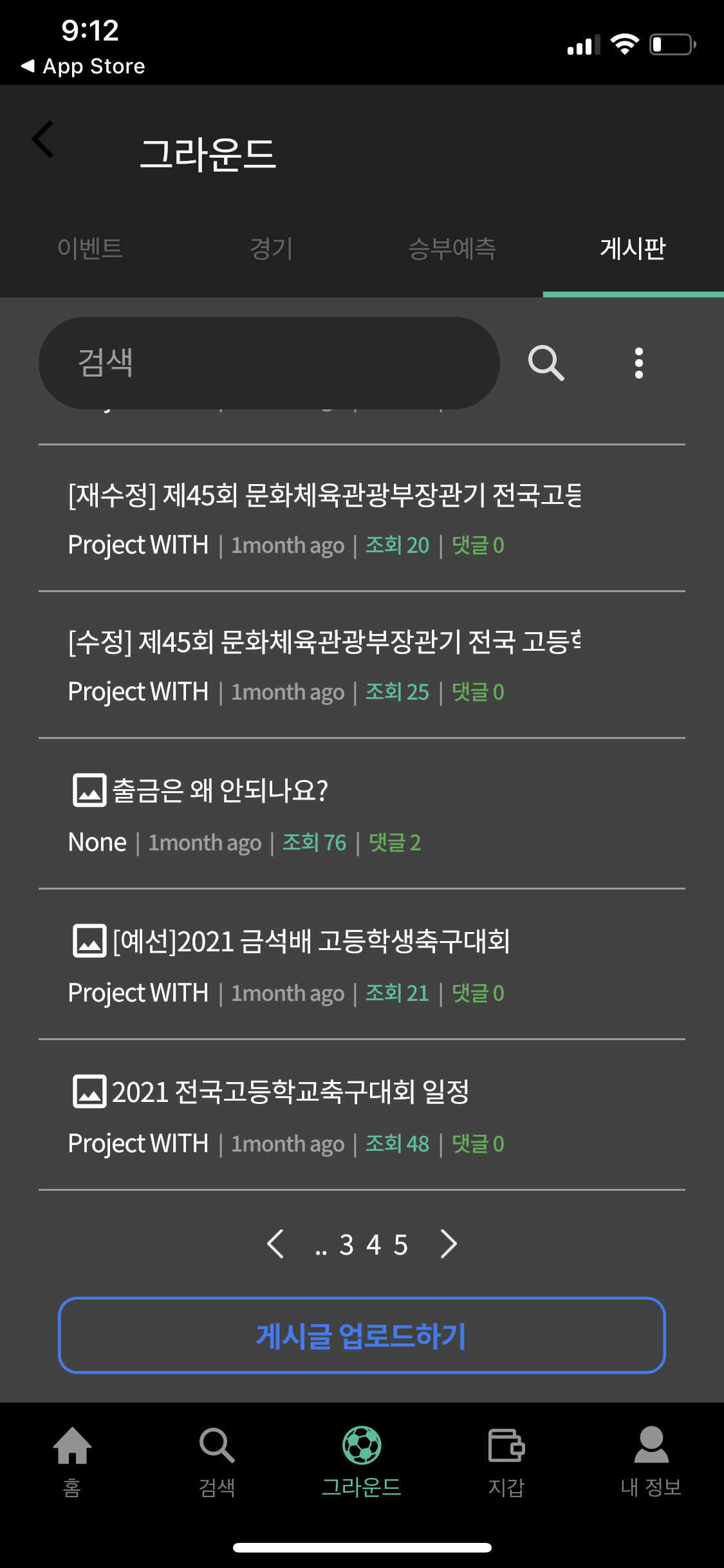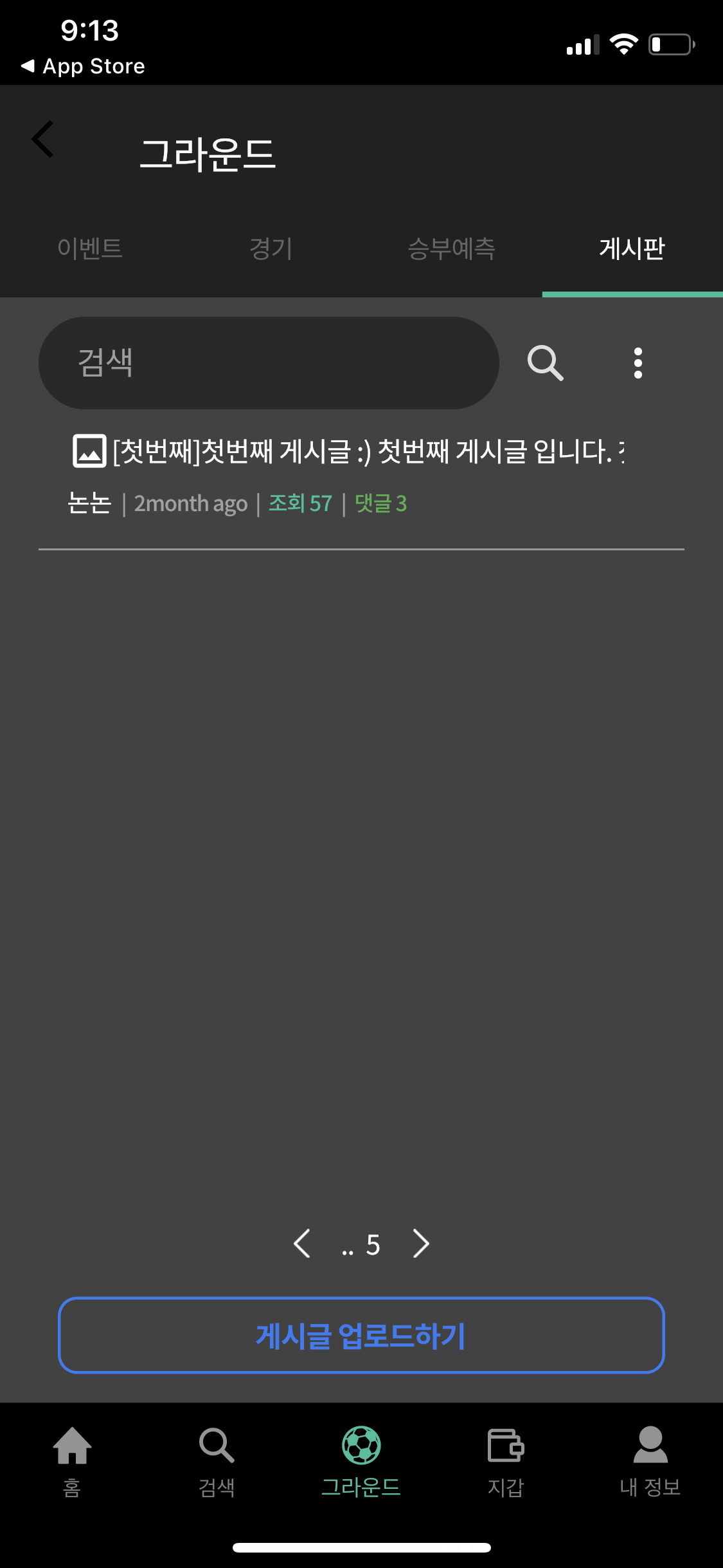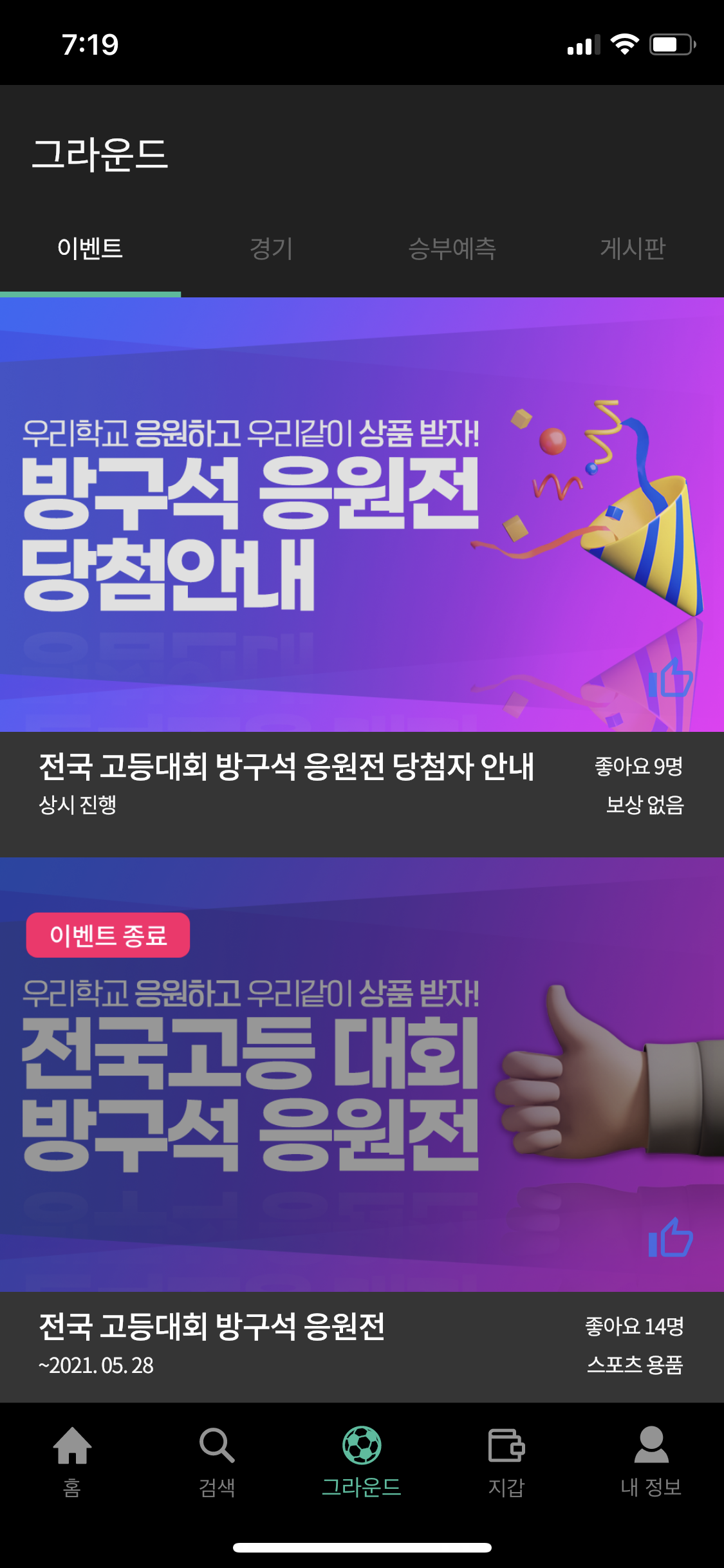 그라운드 메뉴에 경기, 승부예측 등 다양한 기능을 제공하고자 열어놨지만 현재 준비중인 것을 확인할 수 있습니다.