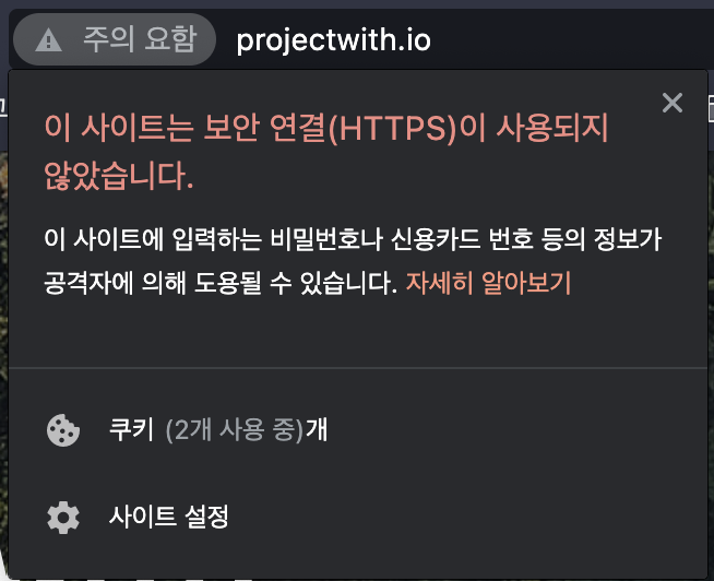 추가적으로 웹사이트에 HTTPS 보안 연결이 사용되고 있지 않은데 이 부분도 마찬가지로 웹사이트 구축에 있어서 정말 가장 기본적인 부분이라 이를 누락시키고 개발을 완료했다는 점은 굉장히 좋지 않아 보입니다.