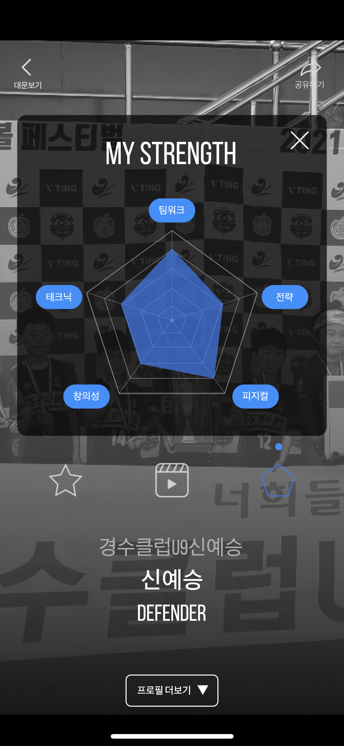 플레이어들의 정보를 살펴보면 선수의 기본정보와 플레이 하이라이트, 스텟 등을 보여주고 있습니다. 이 부분은 축구게임(피파)을 좋아하시는 분들이 굉장히 좋아할 것 같네요. 선수의 능력치를 그래프로 표현함으로써 시각적으로 재미를 줍니다.
