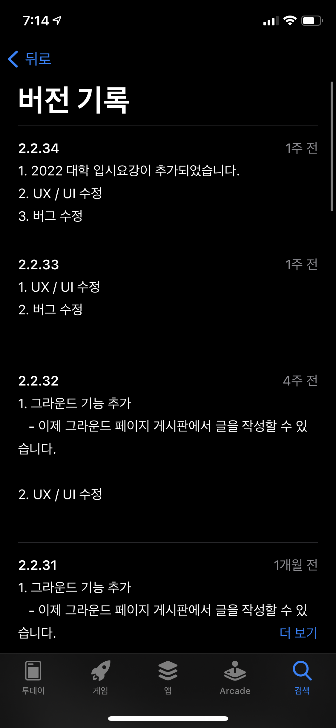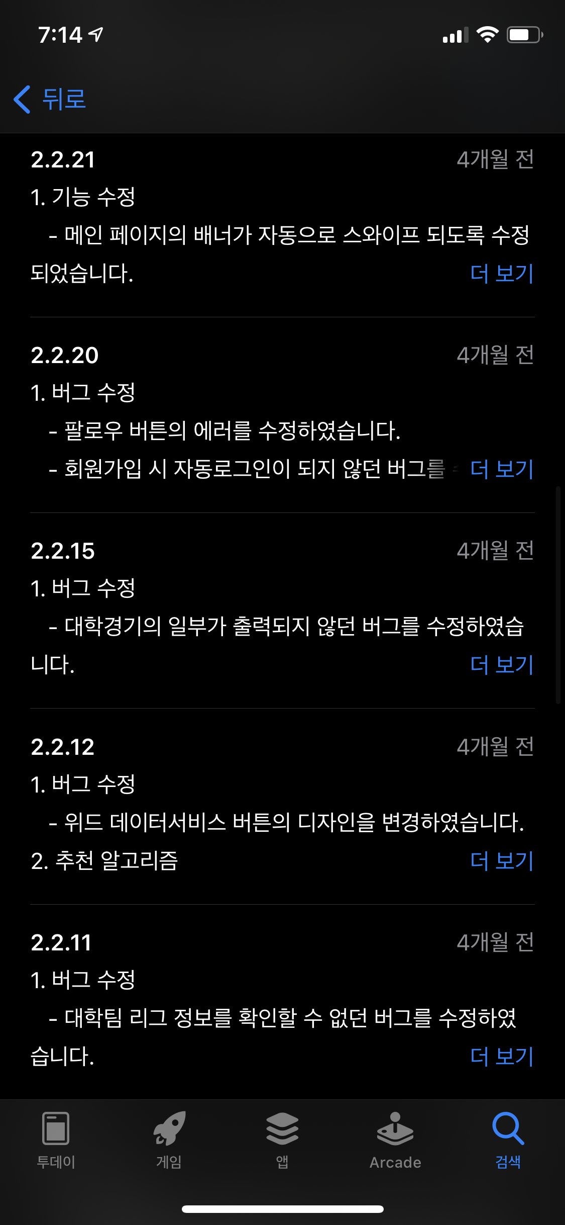애플리케이션 업데이트 버전 히스토리를 살펴보면 업데이트가 빈번하게 이뤄지는 편은 아닙니다. 단순 UI/UX, 버그 픽스 수준으로 개선작업을 진행하고 있네요.