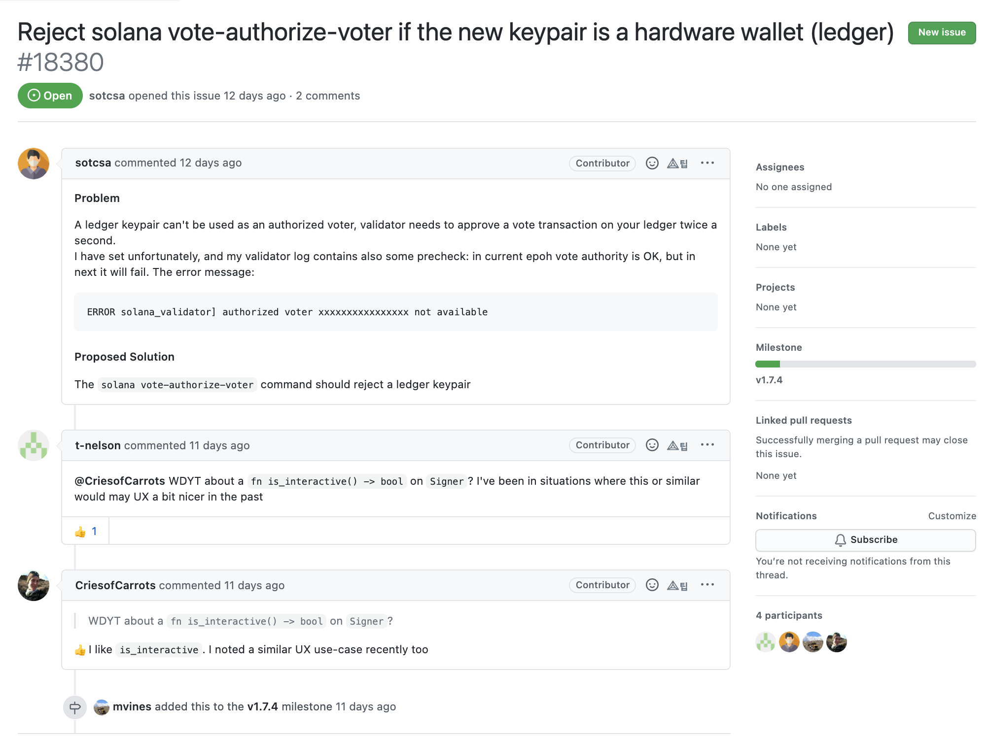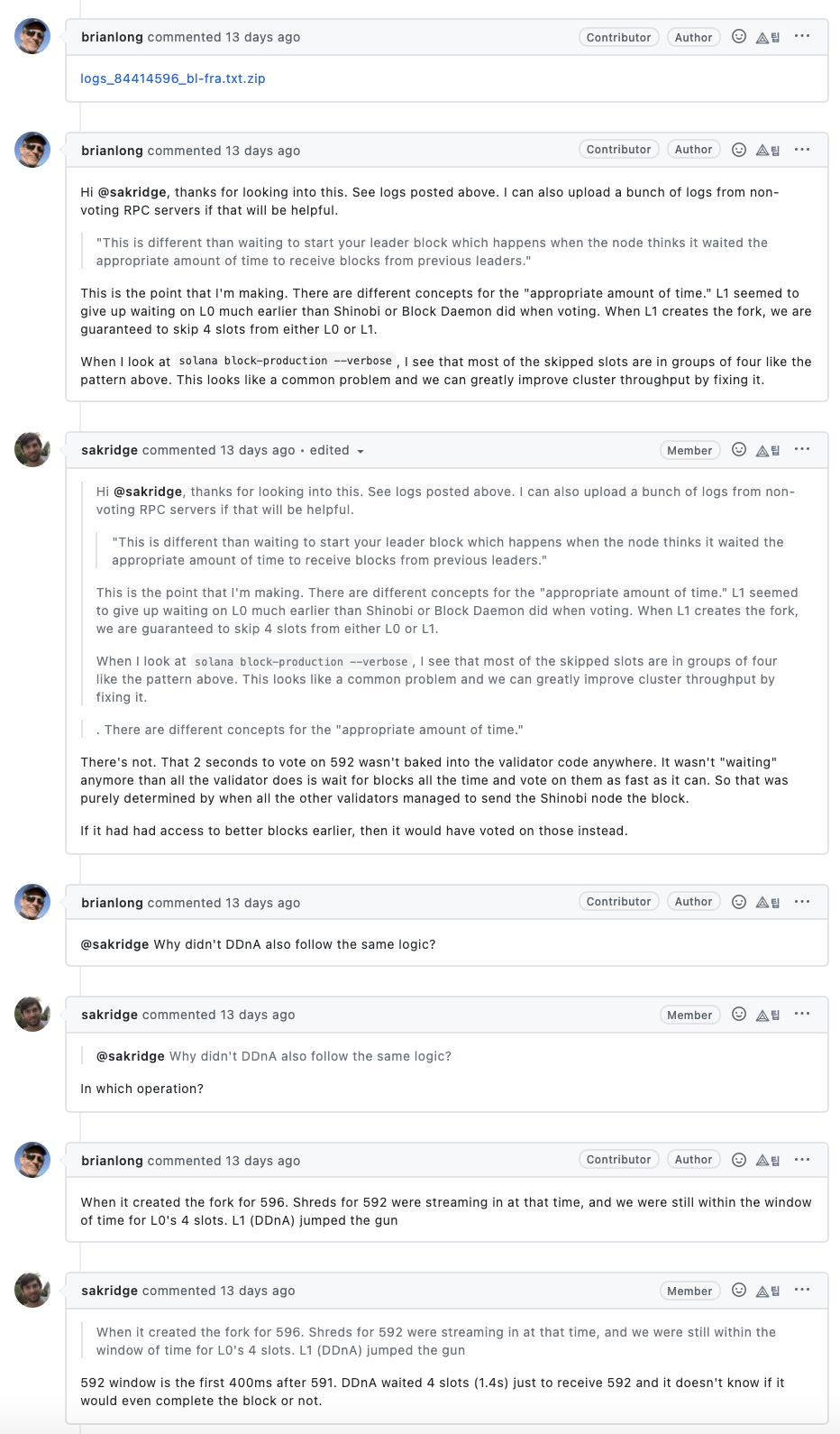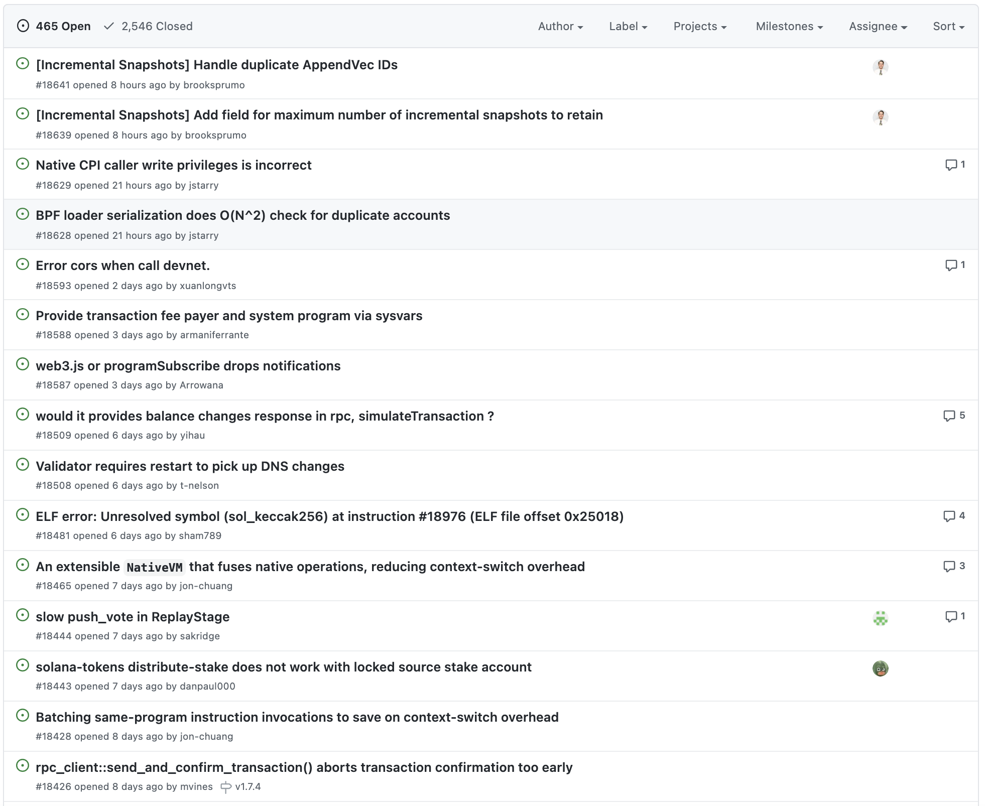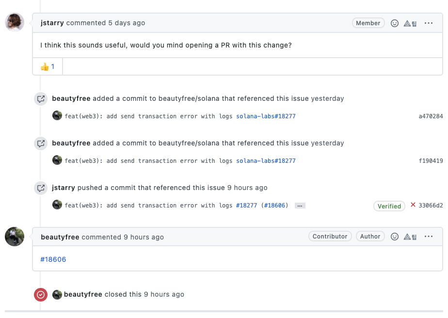 최근 올라온 이슈 일부분만 살펴보긴 했지만 일부를 보더라도 전체적으로 어떤 방식으로 진행하는지 대충 감은 옵니다. 게다가 대부분 프로젝트는 과거에 잘 진행되다가 최근으로 올수록 성의가 없어지는 경우가 많아서 최근 순으로 프로젝트를 살펴보면 오히려 더 더움이 되죠. 솔라나 개발팀의 경우 발생한 이슈에 대해서 해결하기 위해 굉장히 활발하게 커뮤니케이션을 하고 있는 것을 확인할 수 있습니다.