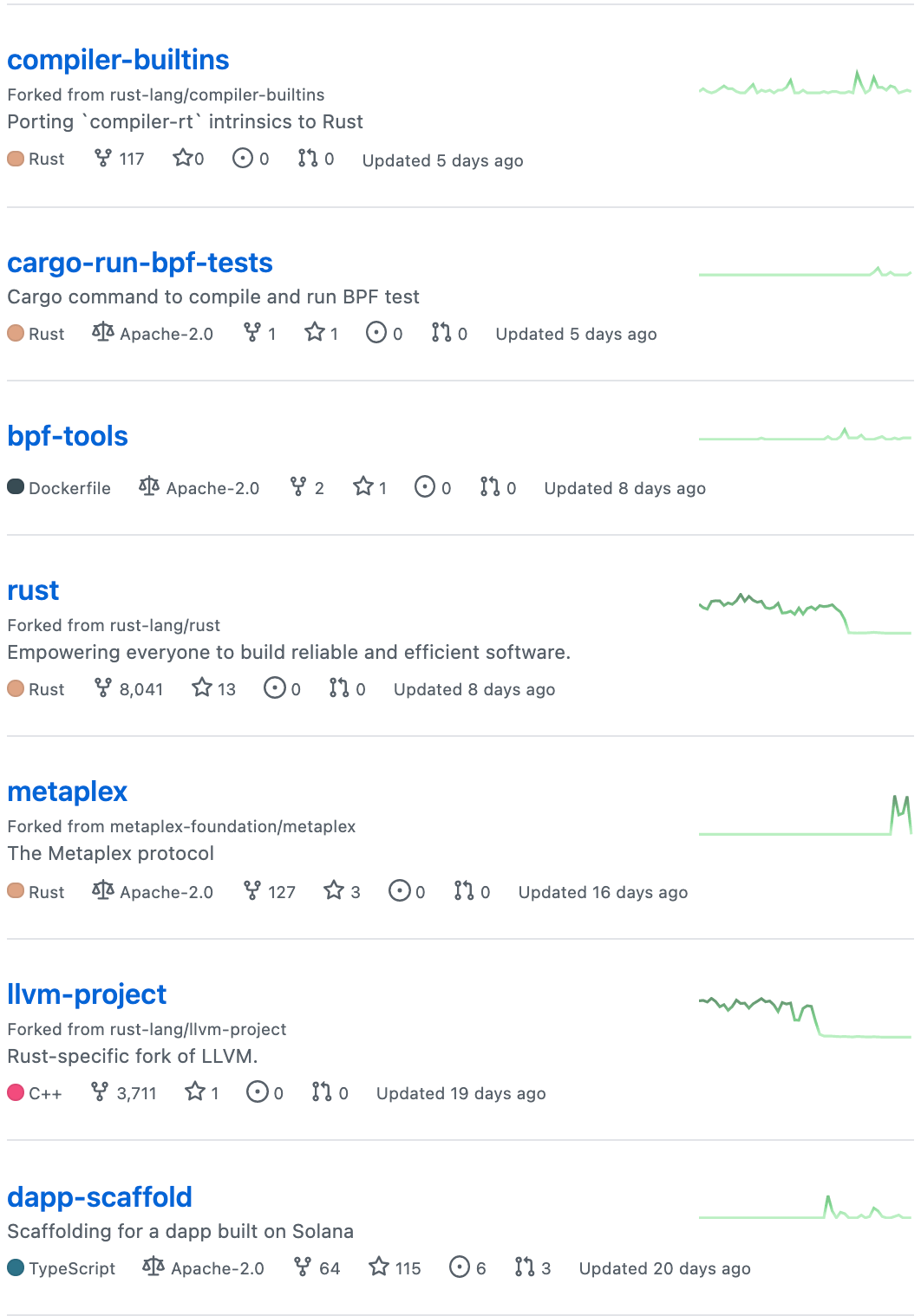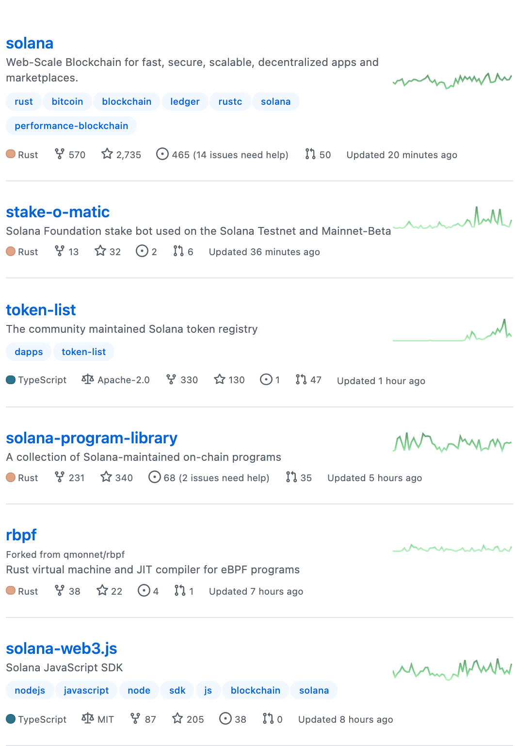 솔라나 개발팀이 현재 공개한 프로젝트들을 살펴보면 활성화된 프로젝트가 꽤 많은 것을 확인할 수 있습니다. 프로젝트마다 우측 활성화 그래프가 존재하는데 해당 그래프를 살펴보면 굉장히 활성화가 잘되어있습니다.