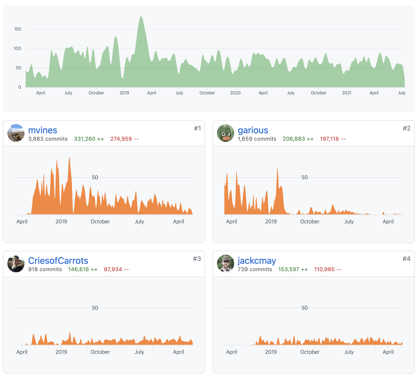 최근 한달동안 프로젝트에서 업데이트된 내용들과 전체 기간동안 프로젝트에 참여한 참여자들을 확인할 수 있습니다.