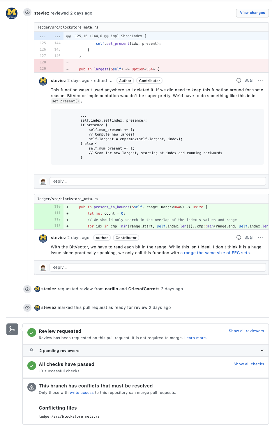 마스터 브랜치에 병합된 PR 목록들을 살펴보면 코드리뷰를 굉장히 잘 진행하는 것을 확인할 수 있습니다.