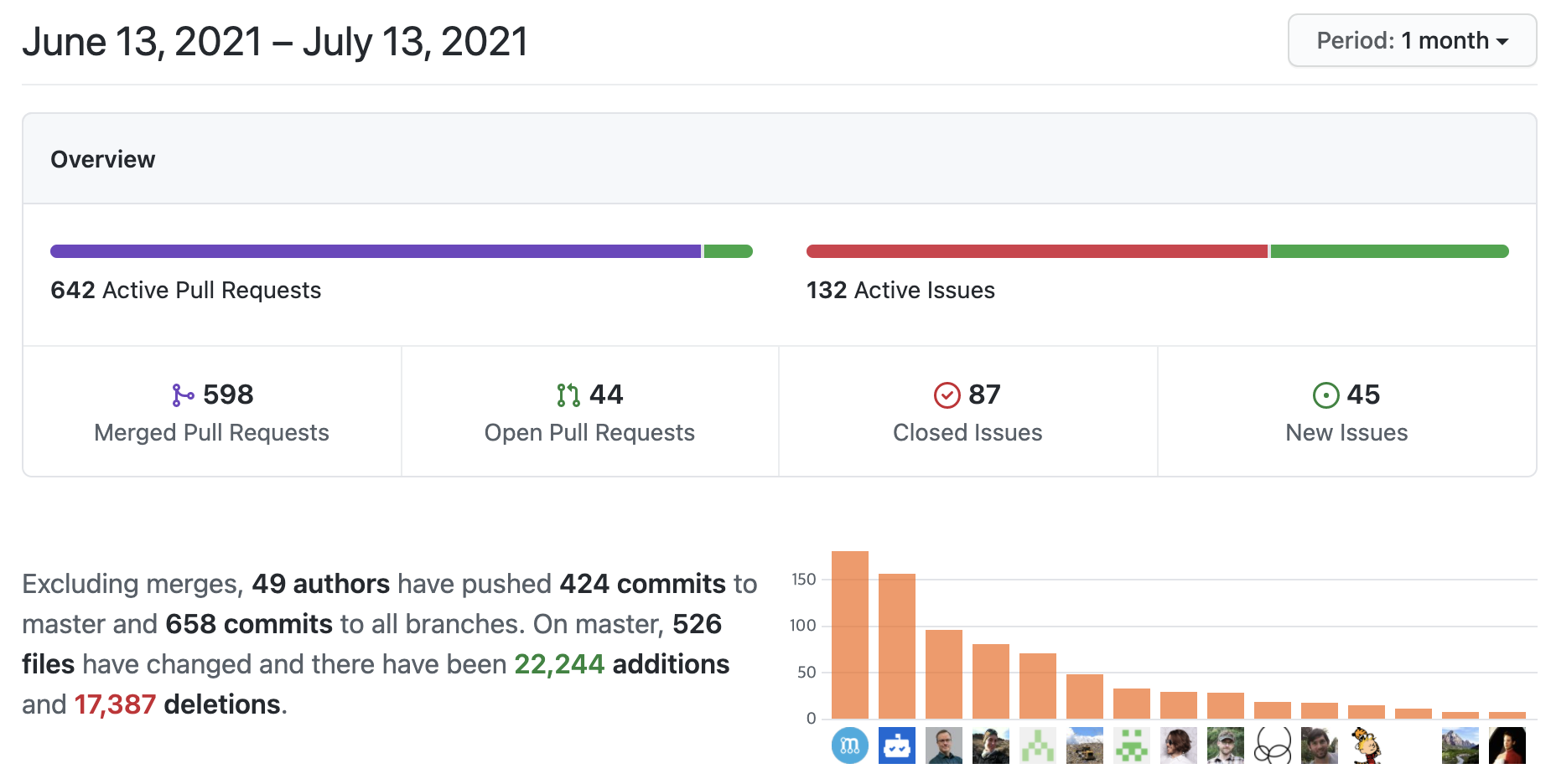 현재 프로젝트에서 열려있는 PR은 50건이고, 종료된 PR은 15,571건입니다. 여기서 확인할 포인트는 PR이 단순히 많다고 좋은 것이 아니라 PR이 열려있다면, 해당 PR들이 언제 열렸는지, 현재 코드리뷰가 되고 있는지를 확인하는 것입니다. PR이 열린지 꽤 되었음에도 코드리뷰가 되지 않고, 마스터 브랜치에 병합되지 않았다는 것은 프로젝트 PR 관리가 제대로 안되고 있다는 것을 확인할 수 있죠.