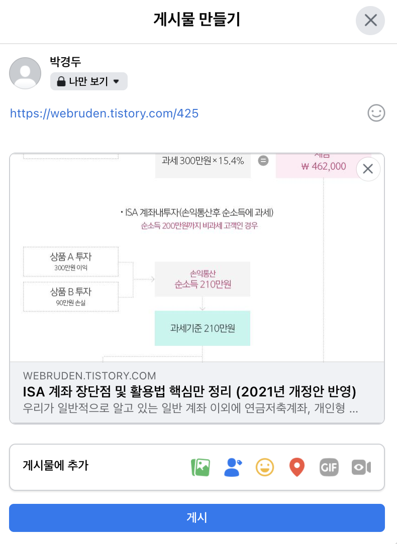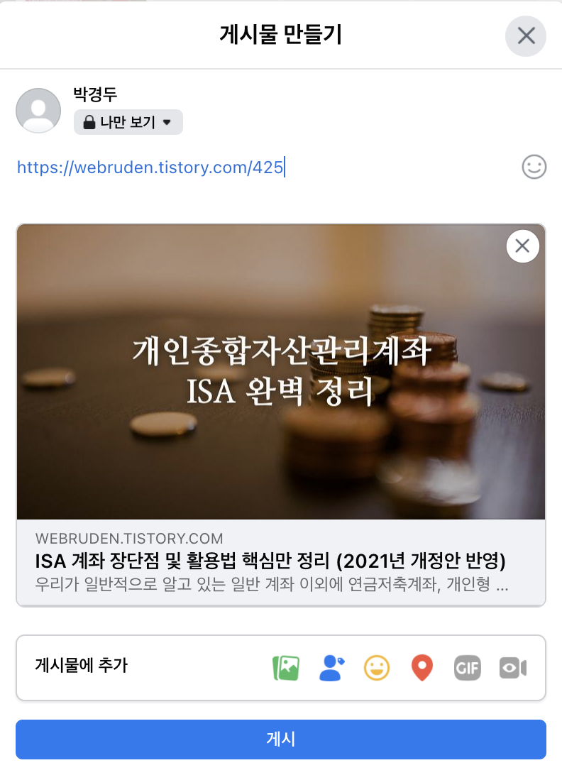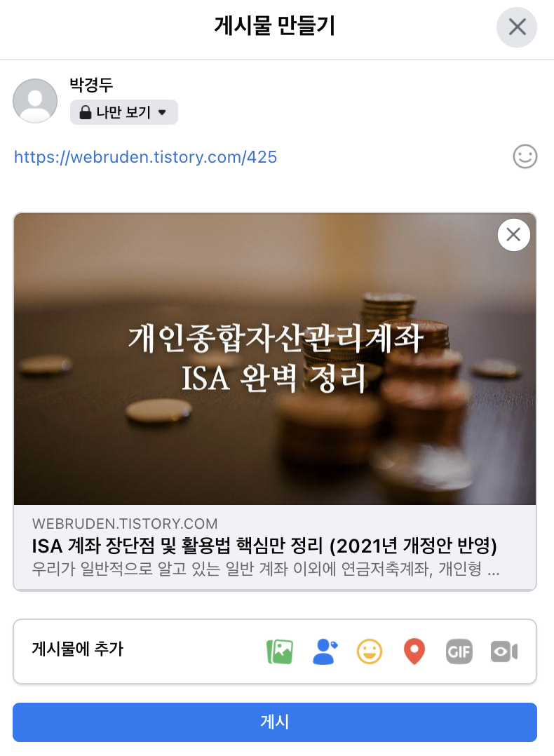 기존에 티스토리 포스팅에서 사용하던 대표 이미지를 아래와 같이 변경하고 페이스북 공유로 테스트하면 이전 오픈그래프 이미지가 노출되는 것을 확인할 수 있습니다.