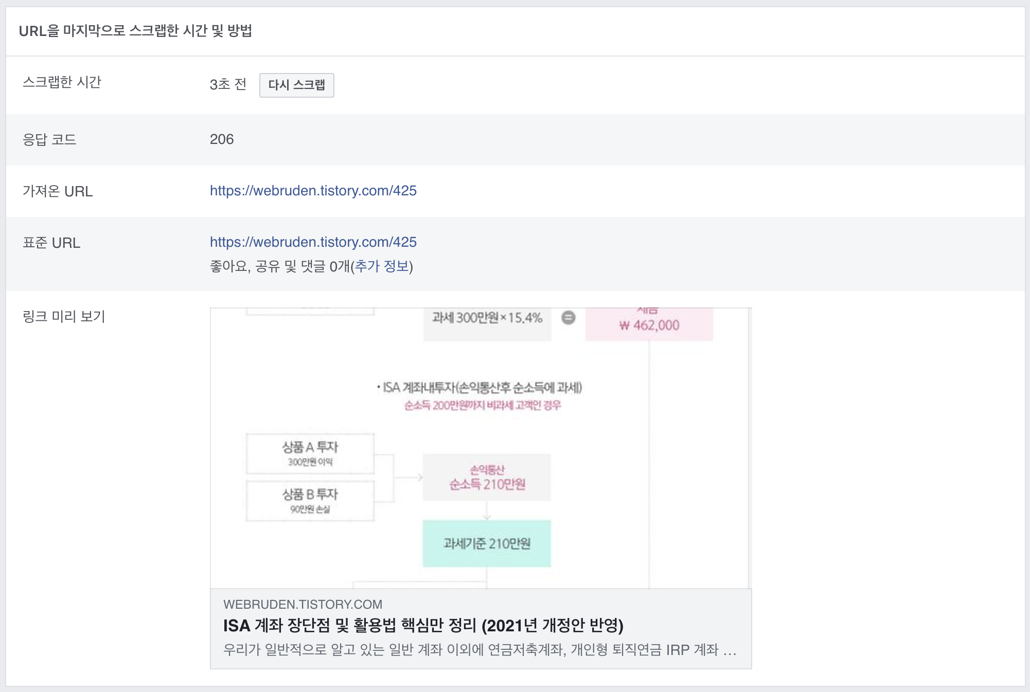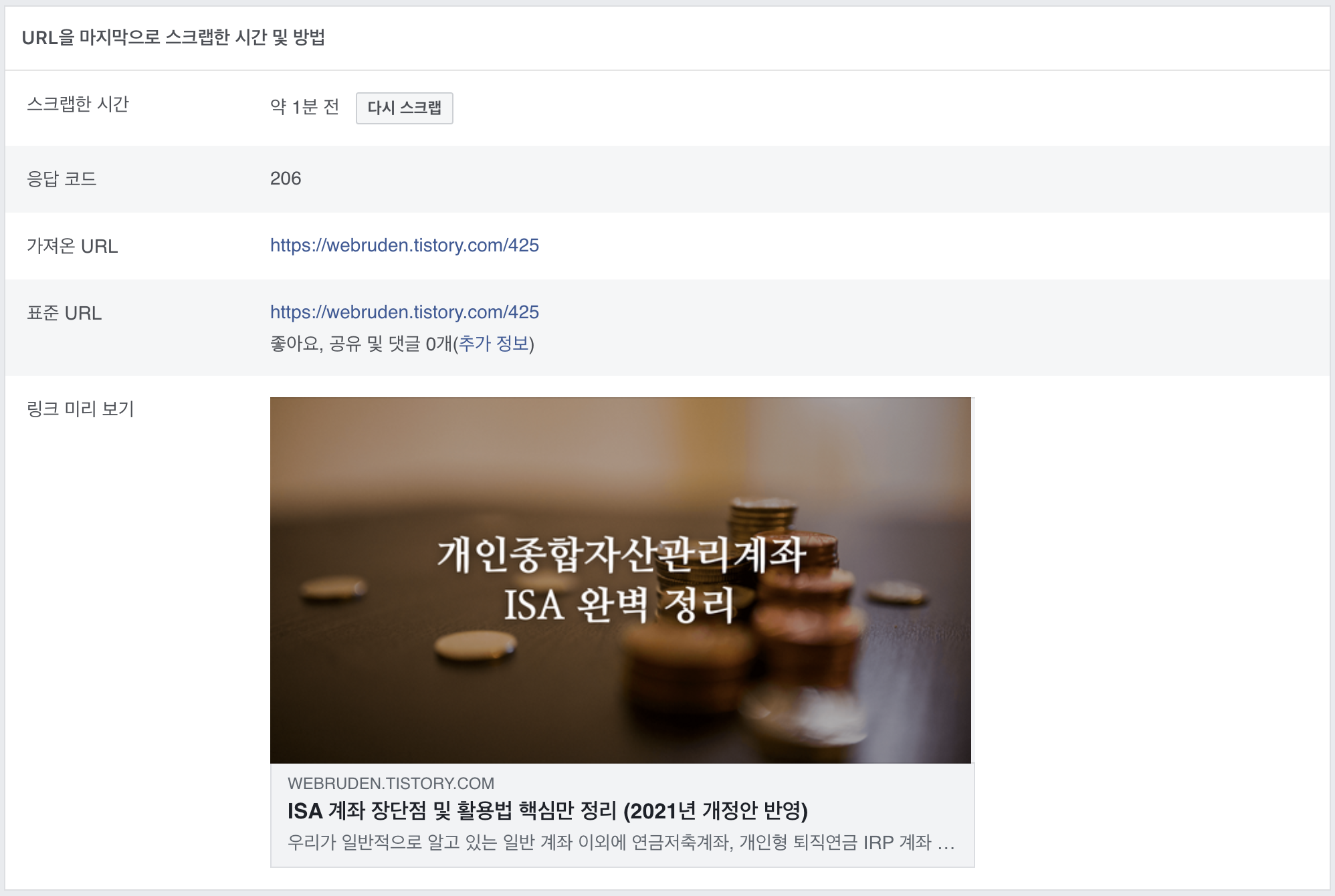 스크랩한 시간 목록 옆에 다시 스크랩 버튼이 있는데 다시 스크랩 버튼을 누르게 되면 페이스북은 해당 URL 콘텐츠를 다시 스크랩을 하고 변경된 데이터를 페이스북 서버에 캐시처리를 합니다. 링크 미리 보기를 통해 변경사항을 바로 확인할 수 있습니다.