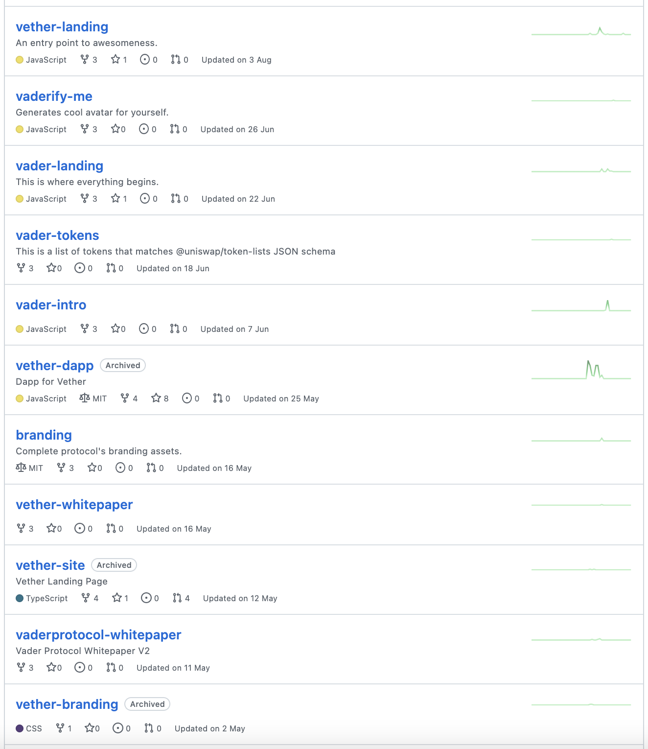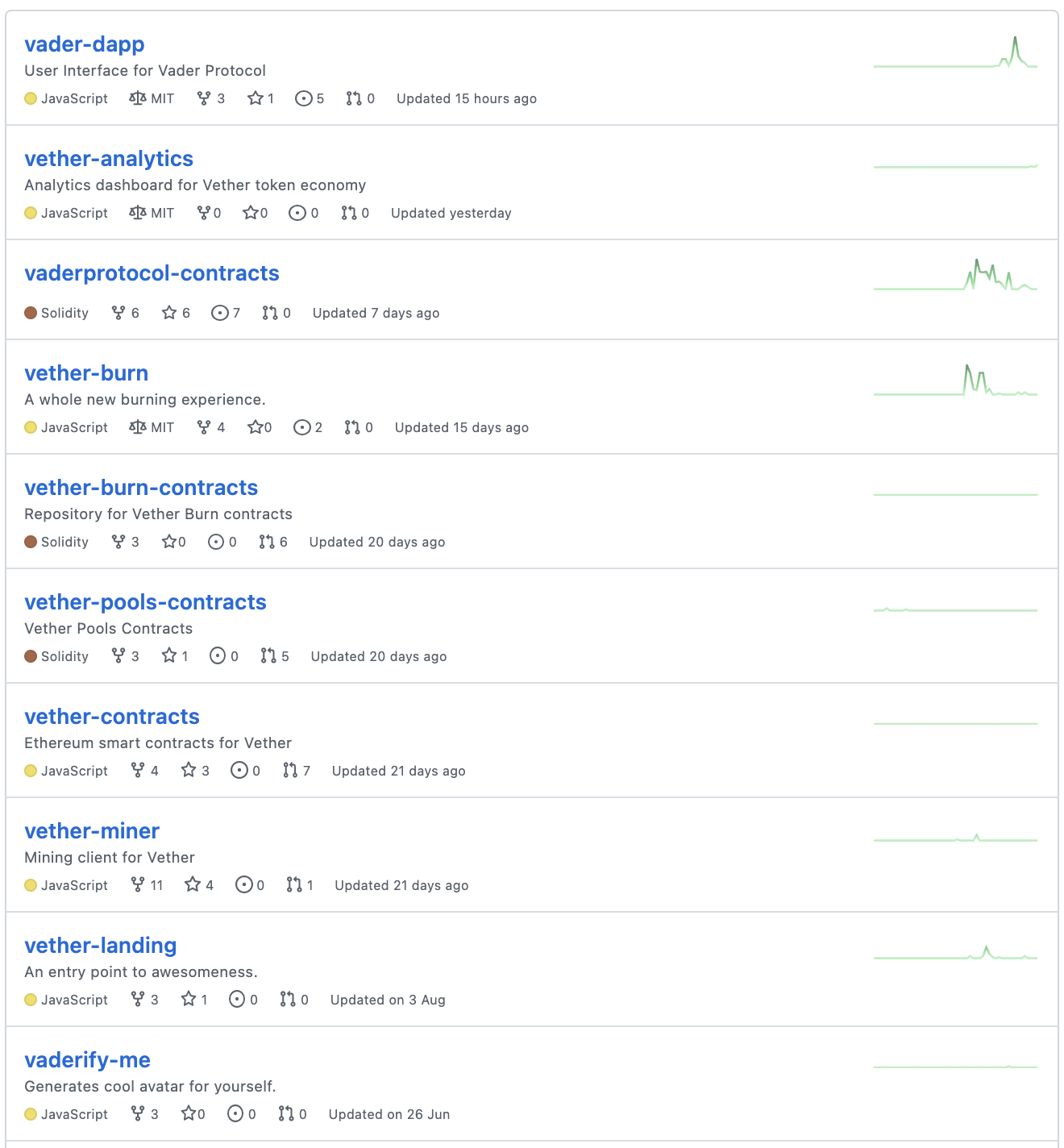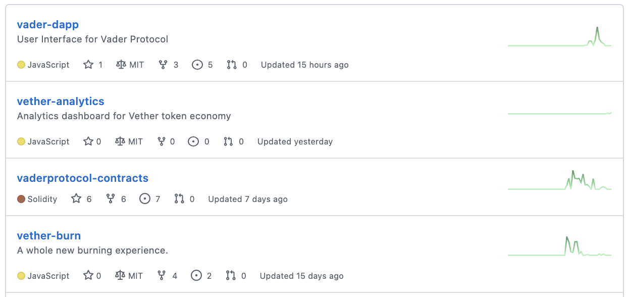그리고 현재 업데이트되고 있는 프로젝트는 4개 정도로 현재 개발 업데이트가 활발하진 않습니다. 최근 일주일 업데이트된 프로젝트는 vader-dapp 프로젝트밖에 없네요.