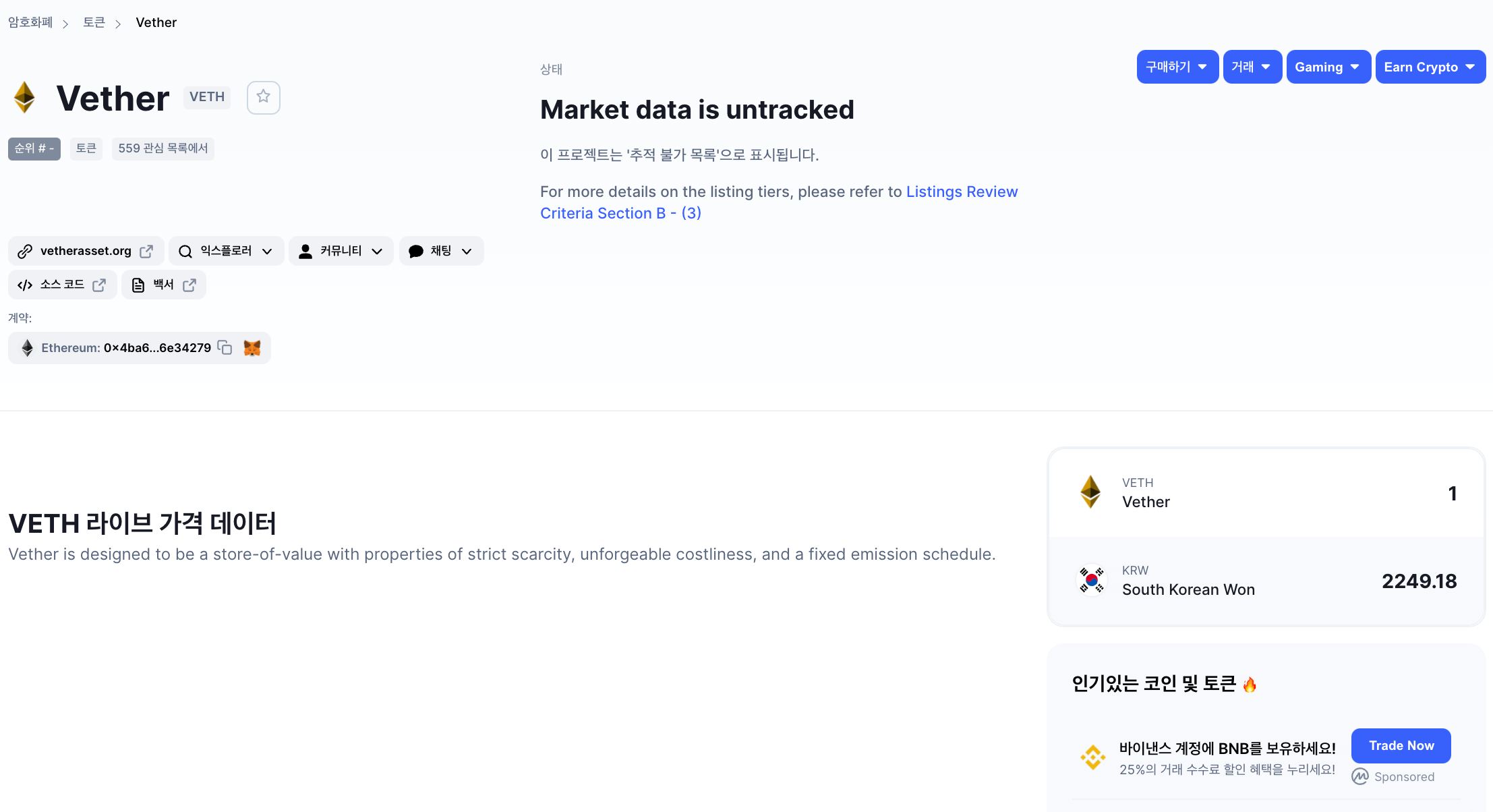 코인 개발 현황에 대해서 살펴보는 것도 중요하지만 해당 코인이 어디 거래소에 상장되어서 유통되고 있는지, 공신력있는 사이트에 정보가 기재되어 있는지를 살펴보는 것도 굉장히 중요합니다. 개인적으로 코인마켓캡에서 추적 불가능한 코인은 조금 꺼려지는 것은 사실입니다. 현재 베더코인은 코인마켓캡에서 실시간 가격 추적이 불가능합니다.