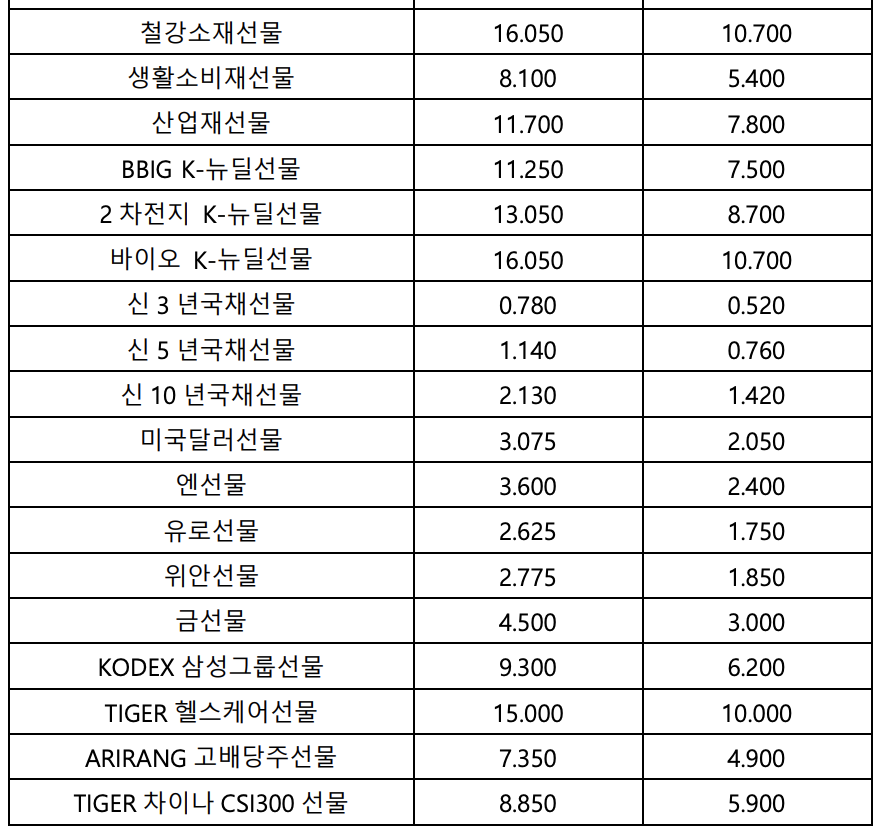 하지만 선물 1 계약을 매매하기 위해 9,700만원이 필요한 것은 아닙니다. 여기에 위탁증거금률이 적용됩니다. 위탁증거금률은 한국거래소에서 매달 발표합니다. 이번 11월에 발표한 코스피 200 선물 위탁증거금률은 8.1%로 선물 가격의 8.1%만 현금을 보유하고 있으면 매수할 수 있다는 의미입니다. 약 786만원정도만 가지고 있으면 코스피 200 선물 1 계약을 매매할 수 있습니다.