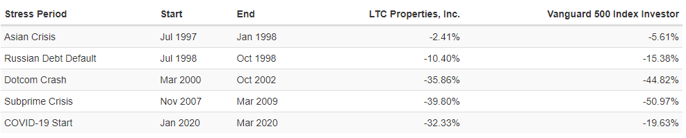 LTC Properties는 초기에 분기배당으로 배당금을 지급하다가 2005년 5월부터 월배당 지급으로 변경했습니다. 2000년 12월부터 배당컷되었던 히스토리(닷컴버블)와 코로나 바이러스 시기에 배당컷되었던 히스토리를 확인할 수 있습니다. 배당 투자를 하는 투자자 입장에서 이렇게 배당컷이 되는 상황이 온다면 굉장히 뼈아플 것입니다.