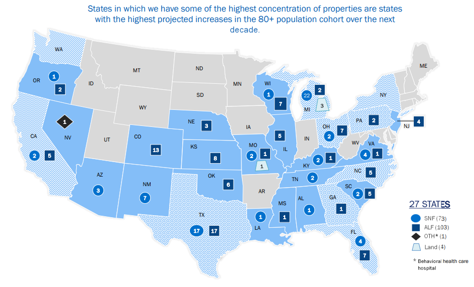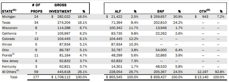 장기 요양 서비스가 활성화된 27개 주에서 텍사스, 콜로라도, 플로리다와 같이 많은 노인 인구가 증가하고 있습니다. 총 투자 집중도를 기준으로 가장 큰 주는 미시간으로 2억 8,200만 달러에 달하는 24개의 부동산이 있습니다.