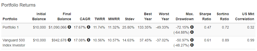 인플레이션을 반영한 LTC의 총 수익은 559,241달러로 한화로 약 6억 5,990만원 정도의 수익을 보여주고 있습니다. 반면에 같은 기간 S&P500 인덱스에 적립식으로 투자했을 때 수익률은 5억 7,067만원으로 S&P 500 인덱스를 상회하는 성과를 보여주고 있습니다.