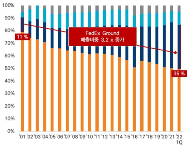 FedEx는 물류 산업의 성장 및 확고한 업계 지위를 바탕으로 지난 20년간 매출 규모가 약 3.2배 증가하였으며, 사업 부문 중 FedEx Ground의 기여도는 점진적으로 증가했습니다.