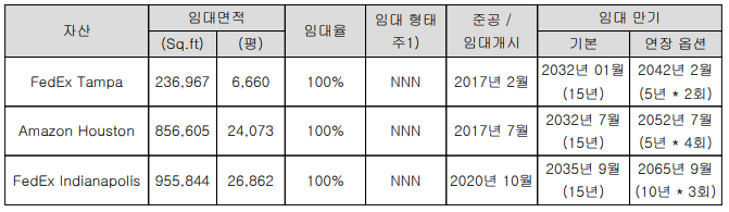 (1) 美 텍사스 Houston Amazon 물류시설, (2) 美 플로리다 St. Petersburg FedEx Ground 물류시설 (3) 美 인디애나 Indianapolis FedEx Ground 물류시설을 시작으로 초기 안정적 현금흐름 확보, 이후 추가 자산 편입을 통해 포트폴리오의 지속적인 성장 및 가치 극대화 계획을 갖고 있습니다.
