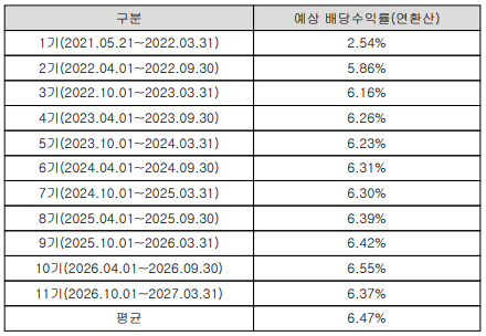 미래에셋글로벌리츠의 예상 배당수익률은 아래와 같습니다. 예상 배당수익률 평균 6.47%를 목표로 설정하고 있습니다. 참고로 기재된 예상 평균 배당수익률은 공모가 5,000원 기준이기 때문에 시가배당률과 차이가 날 수 있습니다. 3월/9월에 배당 결산이기 때문에 제이알글로벌리츠 6월/12월과 같이 분산투자하면 분기배당으로 받을 수 있겠네요.