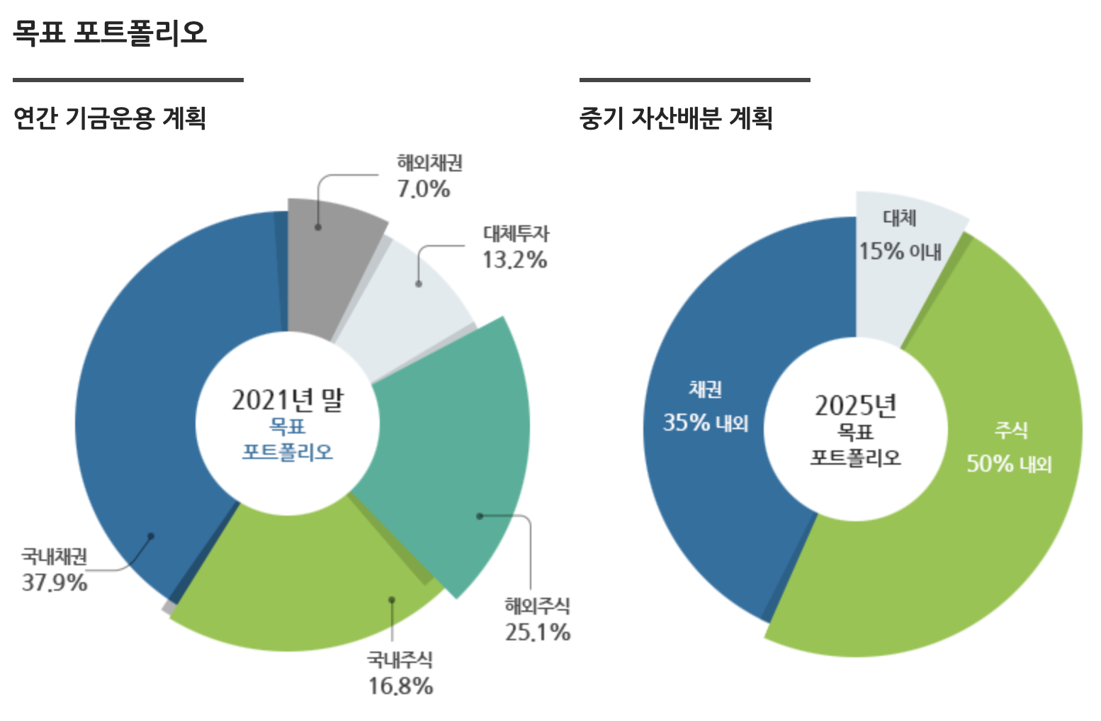 현재 연기금 포트폴리오는 채권 비중이 굉장히 높게 잡혀있는데요. 중기 자산배분 계획에서 주식 비중을 약 50%, 채권 35%로 조정하려는 움직임을 살펴볼 수 있습니다.