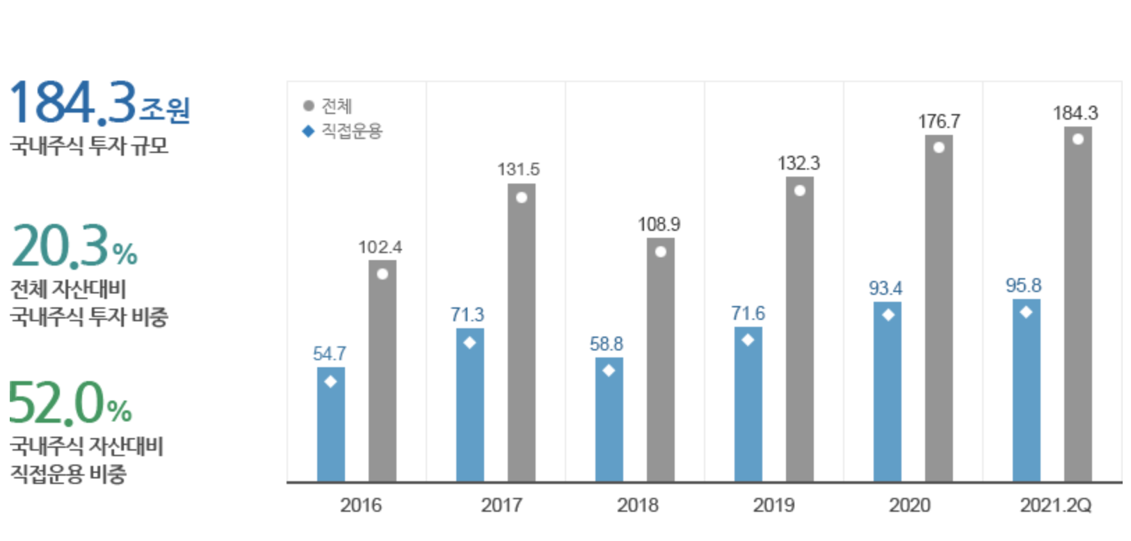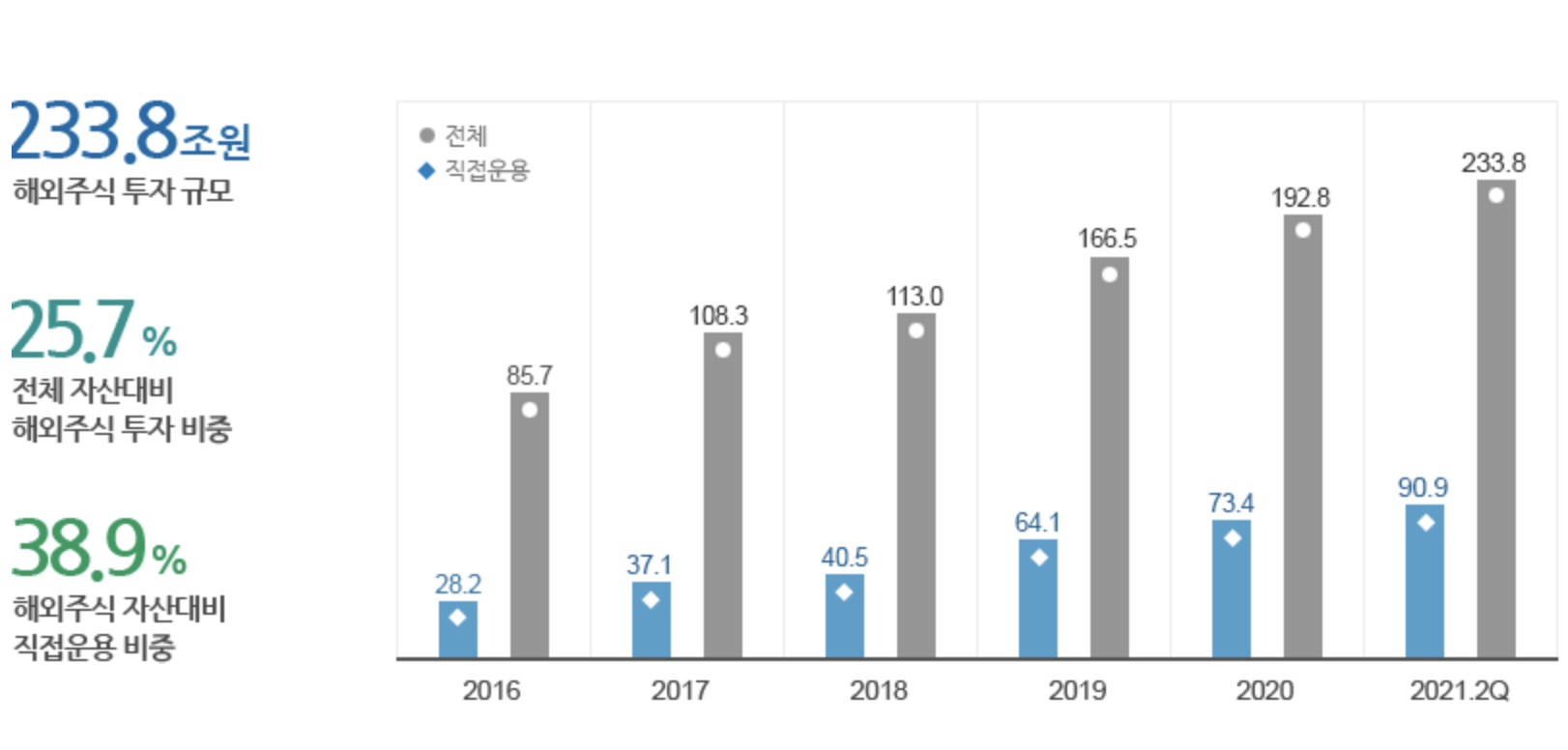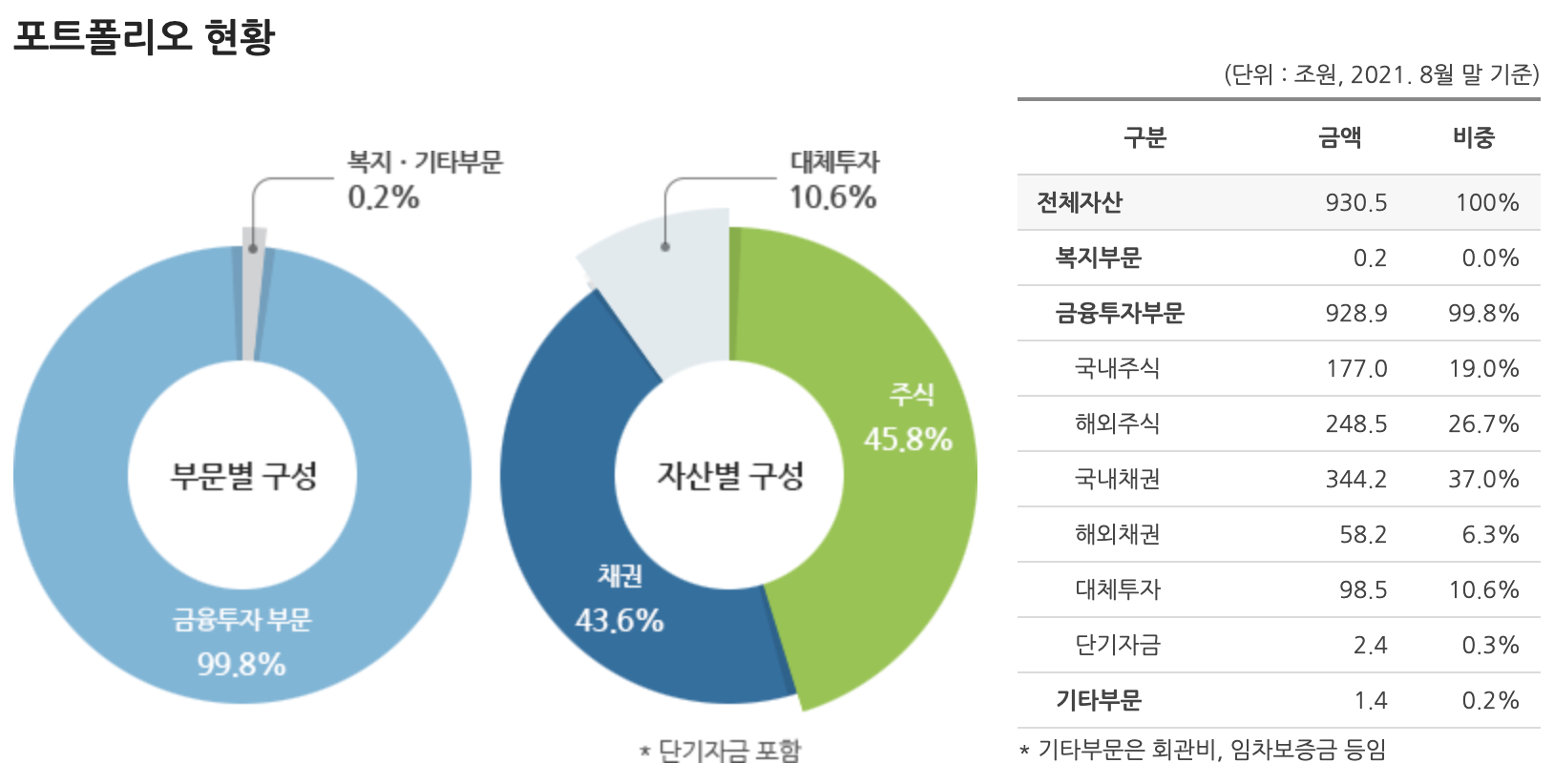 국민연금기금은 1988년 국민연금법에 따라 설치된 이래 지속적으로 성장하여 2021년 8월 말 현재 운용규모가 930조 원에 이르고 있습니다. 기금운용본부는 국민연금기금의 안정적인 성과 제고와 위험 분산을 위하여 국내채권의 비중을 축소하고, 국내외 주식과 대체투자를 확대하는 등 투자 포트폴리오 다변화를 추진하고 있습니다.