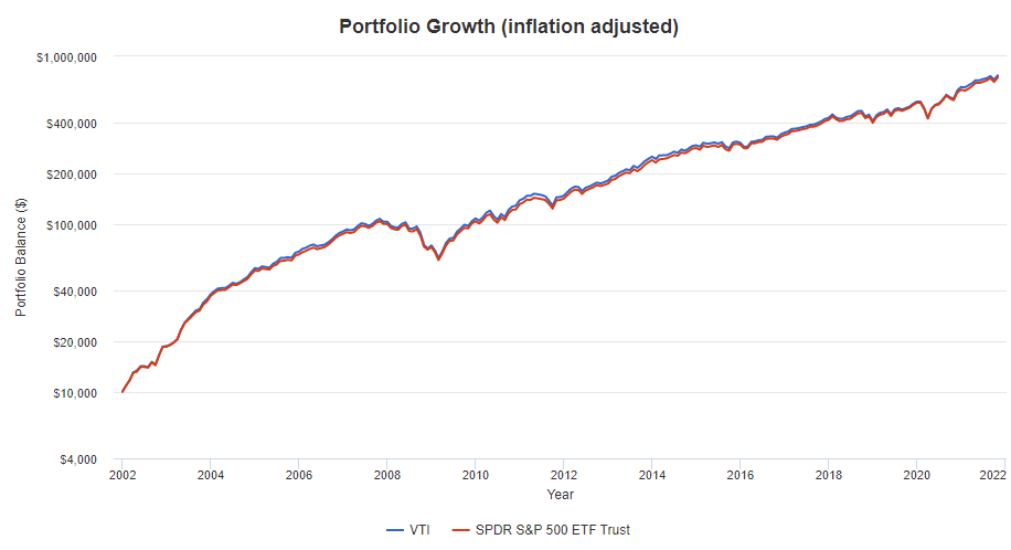 VTI와 SPY ETF를 비교해봤는데 장기투자했을 경우 퍼포먼스는 거의 비슷했지만 VTI가 조금 더 좋은 수익률을 보여줬음을 확인할 수 있었습니다. SPY가 Large로 구성된 반면, VTI가 다양한 시가총액으로 구성된 종목들을 포함하고 있었기 때문에 중소형주에서 좋은 수익률을 냈음을 판단해볼 수 있습니다.