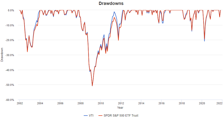 경제위기 마다의 하락폭을 확인해 봤을 때 서브프라임 모기지 사태 때 두 ETF 모두 -50%넘는 하락률을 보이고 있습니다. 미국 전체 주식을 추종하는 ETF가 -50%를 기록하면 도대체 어떤 기분이었을까요..? 상상이 안갑니다. 기초체력이 없었던 중소형주는 상장폐지되었거나 회복불가로 박살이 났었겠죠? 이처럼 우리가 ETF를 통해 분산투자하는 이유는 예상하지 못한 리스크에 대해 어느정도 대비하기 위함입니다. 수익을 내는 것도 중요하지만 그것보다 더 중요한 것은 자산을 지키는 것입니다.