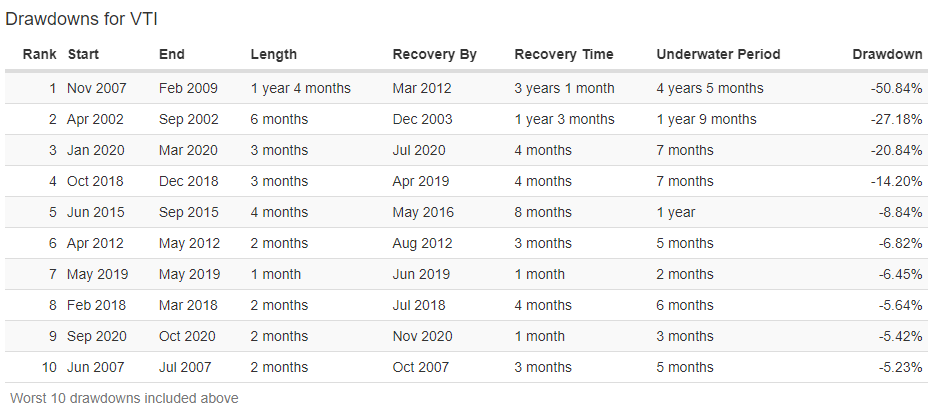 Drawdown 이란 특정 기간에 최대 하락폭(손실)이 발생했는지에 대한 지표입니다. 글로벌 경제 위기 때 하락폭과 회복 기간을 판단할 때 참고할 수 있습니다.