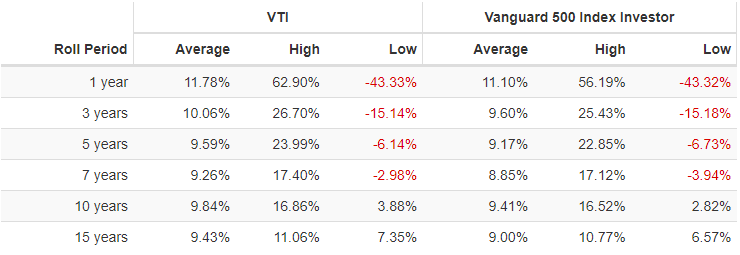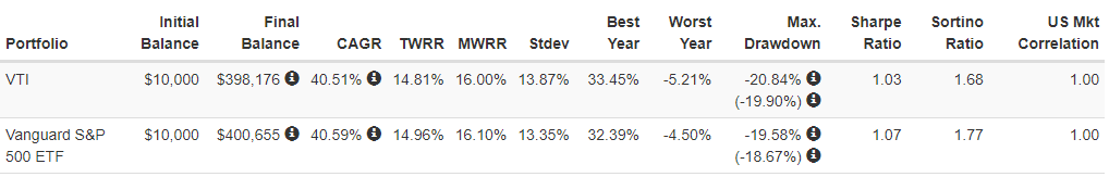 백테스트 결과 투자자산은 VTI($398,176) vs VOO($400,655)로 거의 수치상 차이가 없는 수준으로 결과를 보여주고 있습니다. 미국 전체 주식을 추종하는 지수와 S&P 500 지수의 상승률이 거의 비슷하다고 볼 수 있습니다.