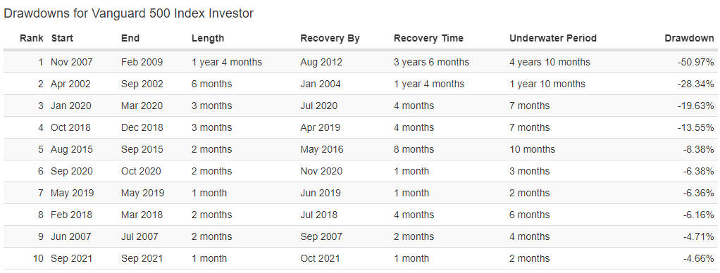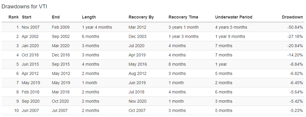 Drawdown 이란 특정 기간에 최대 하락폭(손실)이 발생했는지에 대한 지표입니다. 글로벌 경제 위기 때 하락폭과 회복 기간을 판단할 때 참고할 수 있습니다.