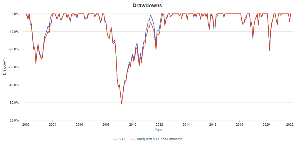 경제위기 마다의 하락폭을 확인해 봤을 때 서브프라임 모기지 사태 때 두 ETF 모두 -50%넘는 하락률을 보이고 있습니다. 미국 전체 주식을 추종하는 ETF가 -50%를 기록하면 도대체 어떤 기분이었을까요..? 상상이 안갑니다. 기초체력이 없었던 중소형주는 상장폐지되었거나 회복불가로 박살이 났었겠죠? 이처럼 우리가 ETF를 통해 분산투자하는 이유는 예상하지 못한 리스크에 대해 어느정도 대비하기 위함입니다. 수익을 내는 것도 중요하지만 그것보다 더 중요한 것은 자산을 지키는 것입니다.