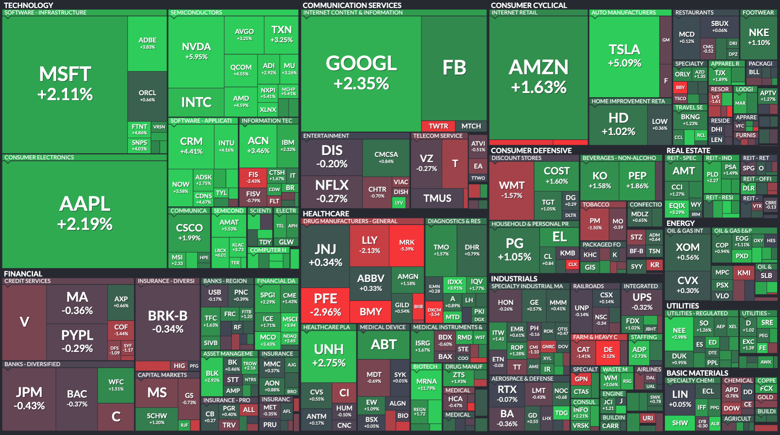 주식 투자에 관심을 갖고 계신 투자자라면 아래와 같이 미국 S&P 500 인덱스에 포함되어 있는 주요 주식들을 보기좋게 한눈에 정리해놓은 맵을 자주 봤을텐데요. 매일 아침 주식 흐름을 살펴보고 싶지만 유튜브나 신문기사들을 하나씩 찾아보기에 쉽지 않습니다. 하지만 핀비즈를 활용하면 전체 S&P 500 인덱스 섹터별 모든 주식들의 흐름을 한눈에 볼 수 있다게 굉장히 좋습니다.